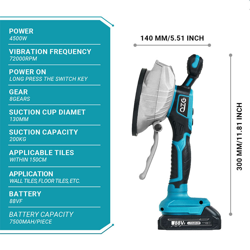 Этот ручной станок для укладки плитки имеет мощность 4500 Вт и частоту вибрации 72000 об/мин, что позволяет лучше укладывать плитку. Длительное нажатие кнопки переключения обеспечивает 8 уровней регулировки скорости для гибкой эксплуатации. Диаметр присоски составляет 130 мм, а сила присасывания — 200 кг. Подходит для настенной и напольной плитки и т. д. размером до 150 см.
