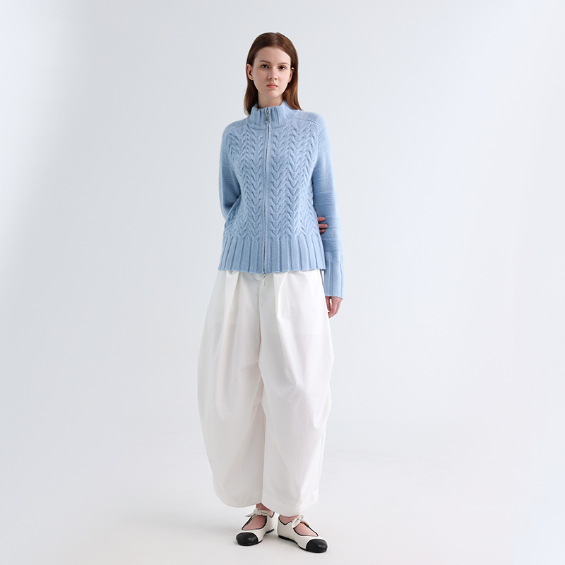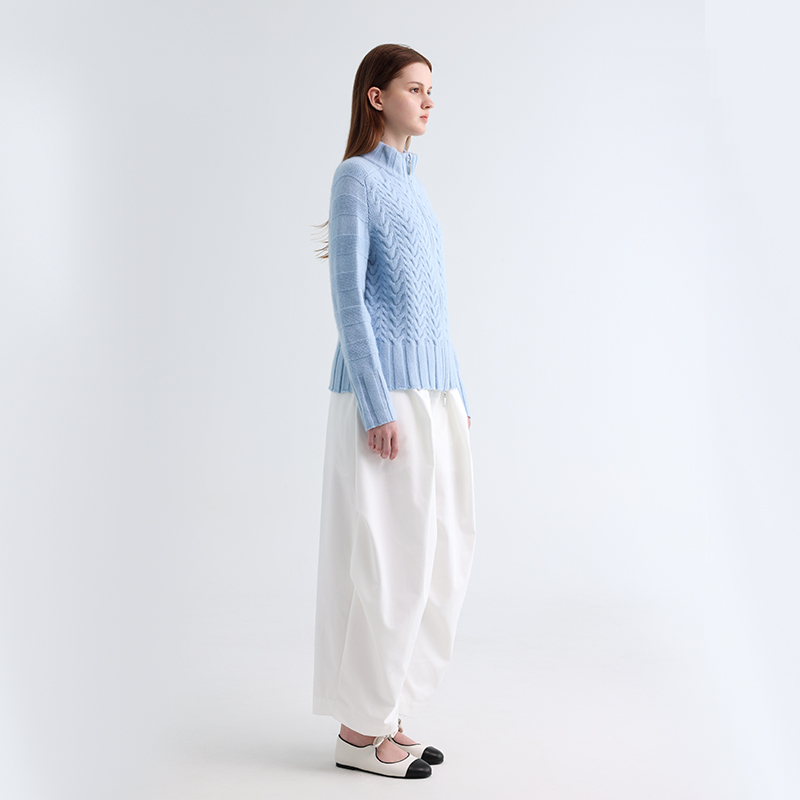 Этот свитер из чистого кашемира одновременно модный и теплый. Воротник-стойка на молнии практичен и практичен. Молнию можно свободно регулировать, что удобно при надевании и расстегивании, а также регулировать уровень тепла по мере необходимости. Многослойный узор переплетения добавляет изысканности и объемности общему образу, демонстрируя уникальную эстетику ручной работы и разрушая монотонность однотонных свитеров.