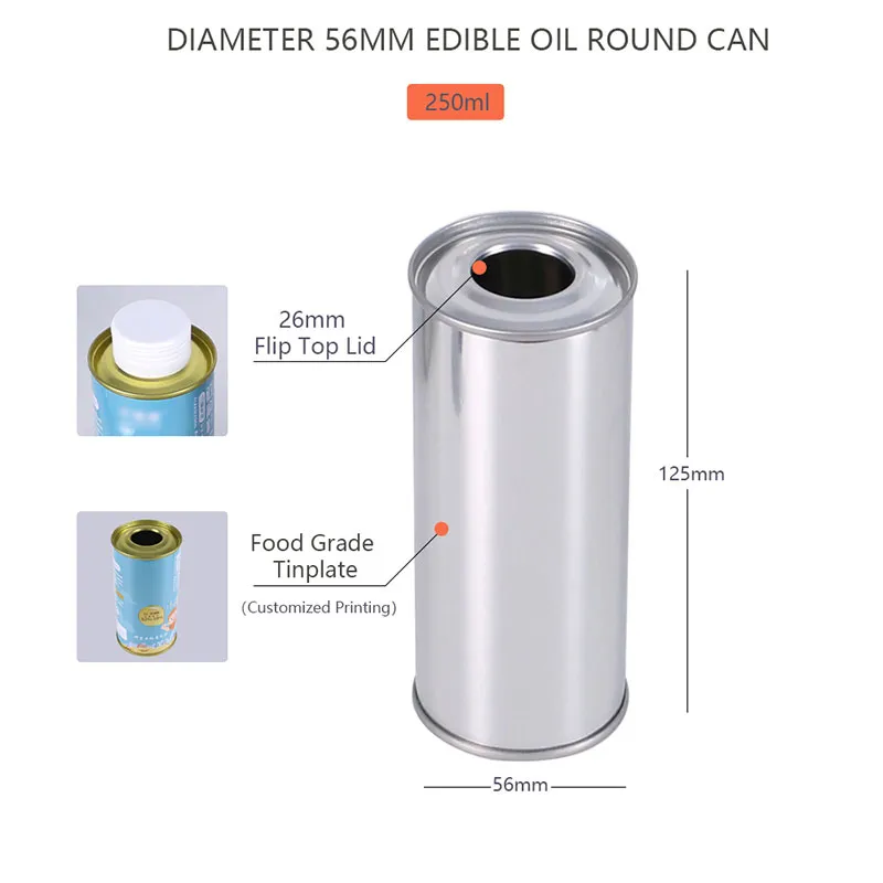 Откройте нашу коллекцию маленьких жестяных банок для оливкового масла объемом 250 мл, разработанных для пищевой упаковки растительного масла. Изготовленные из переработанной жести, эти круглые металлические банки от TCE-Tin Can Expert предлагают долговечность, возможности индивидуализации и экологичность.