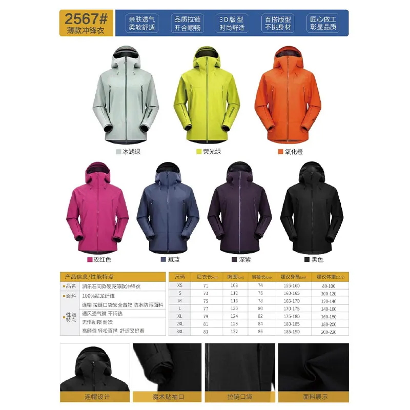 Данная модель 2567# — облегчённая ветрозащитная куртка, созданная для пользователей, ценящих удобство и функциональность, достигла превосходного баланса в цветовых решениях, характеристиках и крое. В палитре представлено семь вариантов: свежий и естественный зелёный «лёд озера», энергичный оранжевый «оксид», яркий и модный розово-малиновый, а также флуоресцентно-зелёный, тёмно-синий, глубокий фиолетовый и классический чёрный, что отвечает как визуальным требованиям активного отдыха, так и разнообразным стилям повседневного гардероба.