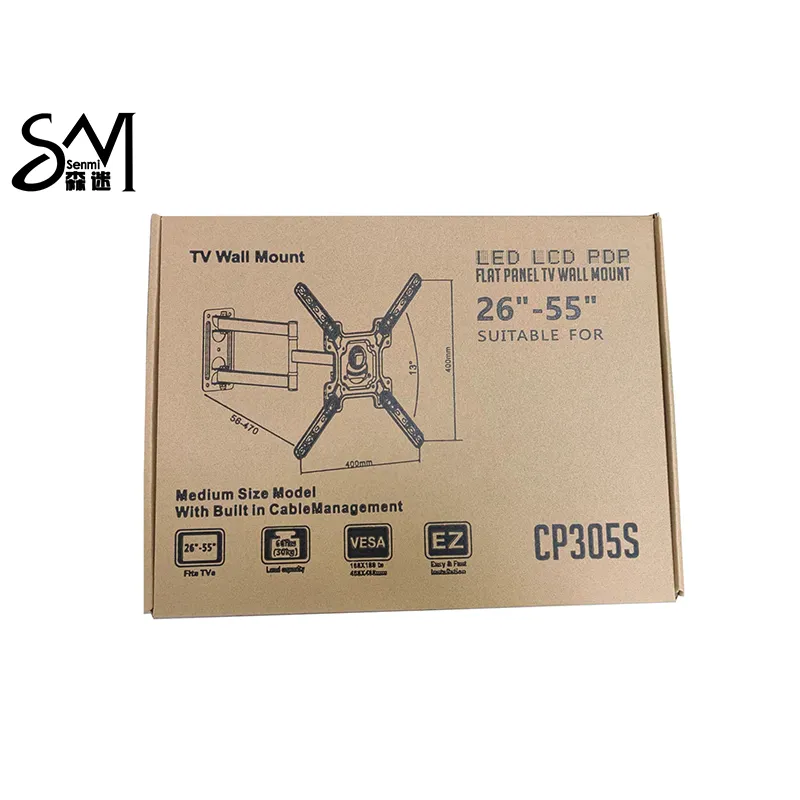 Бескронштейное крепление для ТВ CP305S является одним из самых популярных настенных креплений среднего размера на нашем производстве. Данное полнорычажное настенное крепление имеет простую конструкцию и очень легко устанавливается. Бескронштейное крепление имеет утолщенную базовую пластину толщиной 1,5 мм, поэтому грузоподъемность настенного крепления может достигать 30 кг. Диапазон наклона и поворота данной модели достаточно велик для регулировки. Поворотное настенное крепление может регулироваться влево и вправо на полные 180 градусов, и вверх и вниз на полные 13 градусов. С максимальным стандартом VESA 400*400, подходящий размер данного крепления составляет 26"-55". Модель CP305S является полнорычажным настенным креплением для LED/LCD телевизоров. Настенное крепление изготовлено из высококачественного холоднокатаного листа. Кроме того, данное шарнирное крепление штампуется в целостную форму, что увеличило его грузоподъемность на 15%. Дополнительно мы предоставляем сопутствующие аксессуары к креплению для удобства установки клиентами.