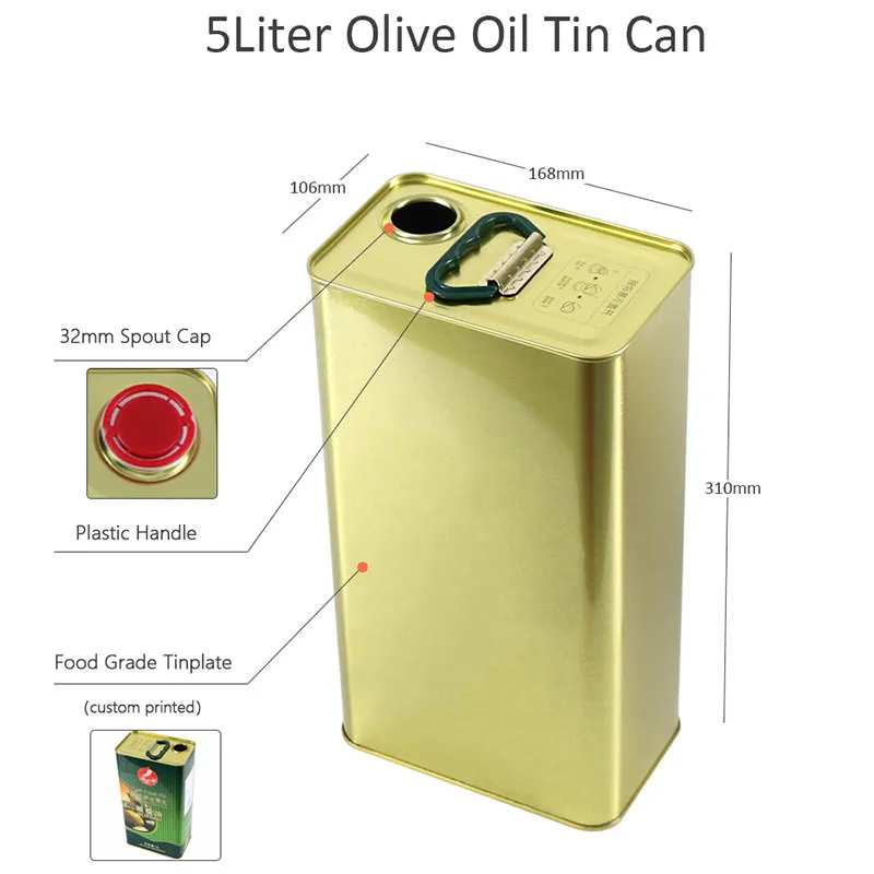 Откройте для себя наши 5-литровые жестяные банки для оливкового масла, изготовленные из прочной жести с возможностью индивидуальной печати. Идеально подходят для сохранения свежести и продления срока годности. Экологически чистые и штабелируемые, идеальны для транспортировки и хранения.