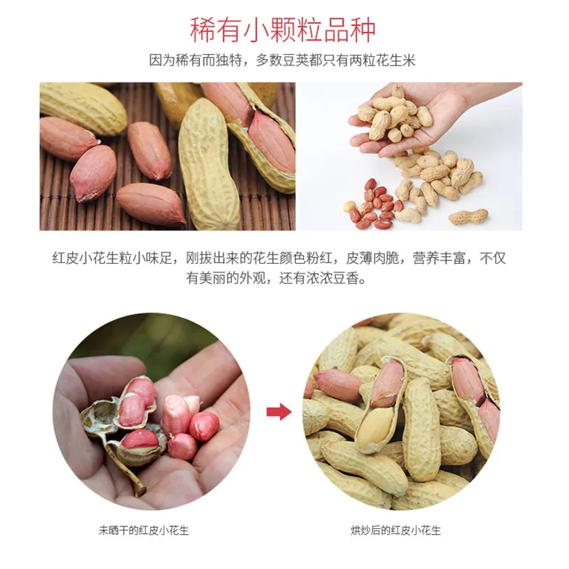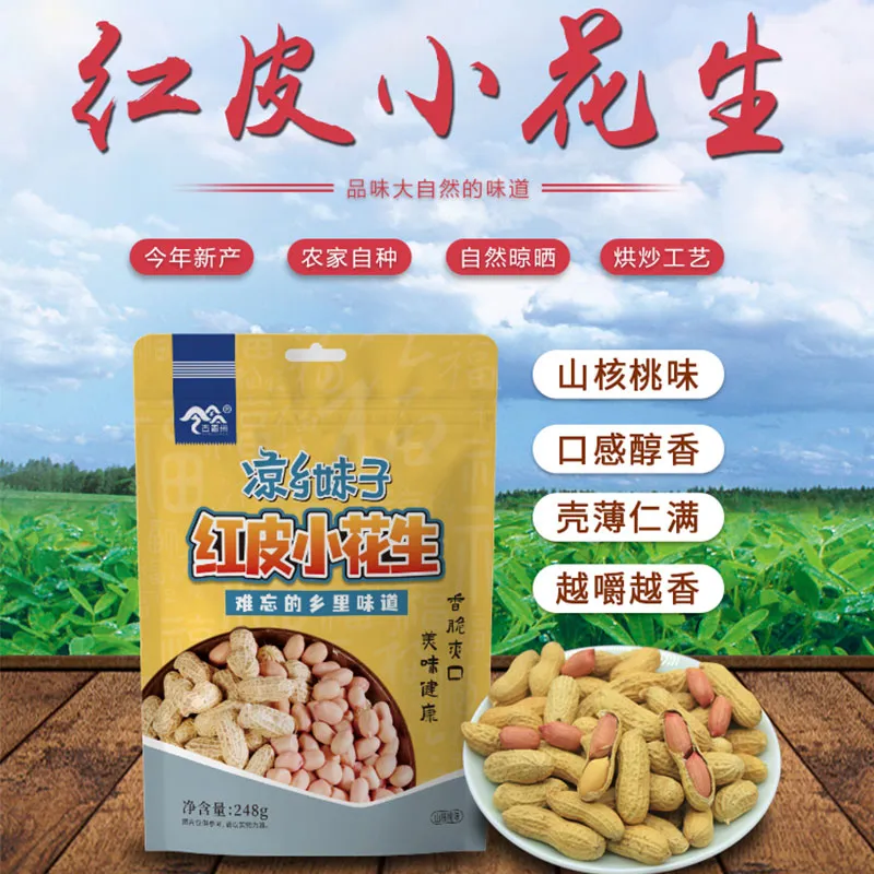 1.Краснокожий арахис, также известный как земляной орех, выращивают в городе Келоу, волости Лянсян, уезда Цэнгун, провинции Гуйчжоу, на высоте 1300 метров над уровнем моря. Фермеры выращивают его на свободном выгуле и естественным образом сушат на солнце, что позволяет сохранить его оригинальный вкус. После обжарки арахис приобретает хрустящую, солоноватую текстуру со сладким послевкусием, создавая ароматный, полезный и питательный вкус.