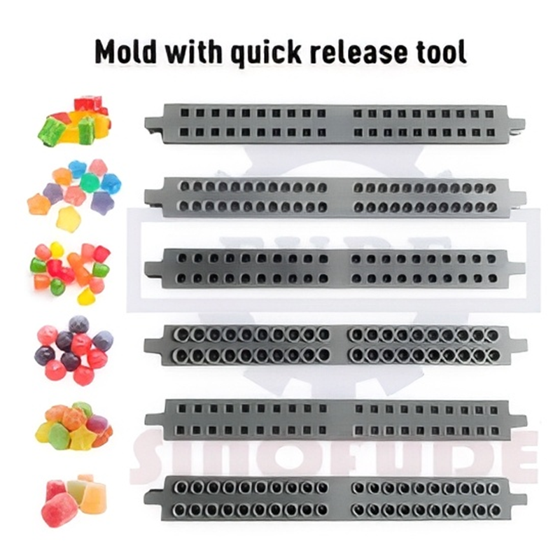 Формы могут быть металлическими с антипригарным покрытием или из силиконовой резины с механическим или воздушным выталкиванием. Они состоят из секций, которые можно легко снять для замены продуктов, очистки покрытия.