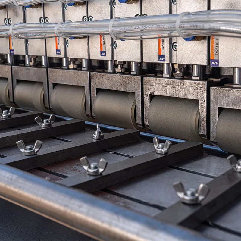 Описание линии: Восьмиосная разматывающая стойка (внутреннее отверстие ø200–450 мм, внешний диаметр ≤ø1400 мм) имеет четырёхрядную двухосевую компоновку. Каждая ось оснащена двумя сервоприводами (скорость размотки 2–9 м/мин). Диапазон контроля натяжения составляет 35–500 Н (точность ±1 Н). В системе предусмотрен буферный канал длиной 15 метров, который в сочетании с аварийным устройством на случай обрыва материала может обеспечивать подачу в течение 3 минут. Перед размоткой материал проходит предварительный нагрев для снятия напряжений (регулируемая температура 50–80 °C), что снижает деформацию готовых рёбер. Обеспечивается синхронизация с несколькими единицами нижестоящего оборудования посредством промышленной сетевой связи для согласования общего производственного ритма.
