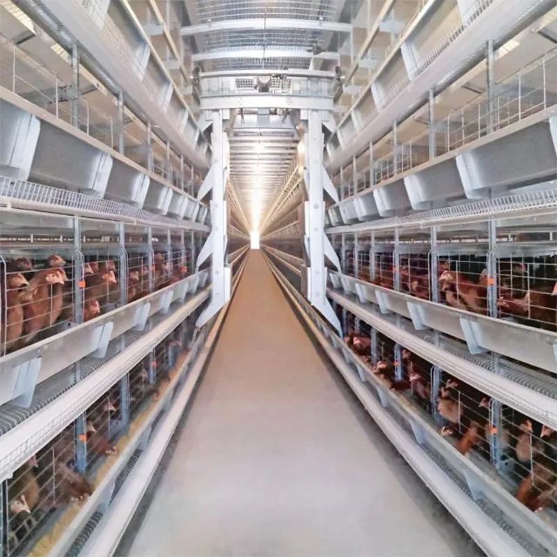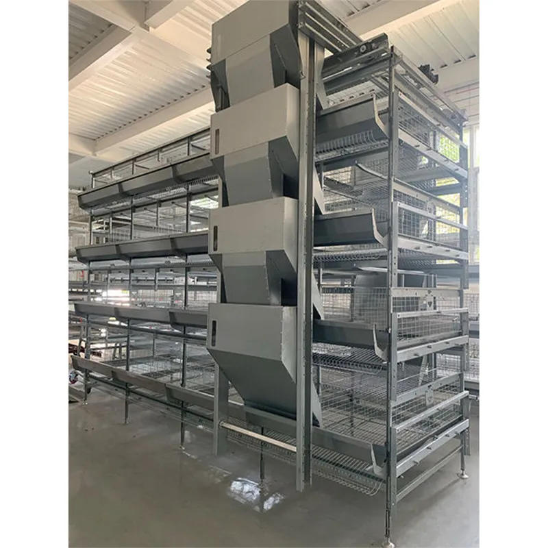 Куриные клетки с A- и H-образными конструкциями, а также клетки для бройлеров оснащены автоматической системой кормления птицы с тележками-кормильниками, предназначенными для использования в скотобойной технике.Метод подачи корма с тележек заключается в том, что корм сначала подаётся из соломенного сарая, расположенного за пределами птицевода, в передний падежник каждой линии куриного клеточного узла с помощью пружинного винтового привода.Затем корм равномерно подаётся в кормовую лунку каждой клетки для отдельного уровня с помощью подвижных тележек. Объём корма в лунке регулируется с помощью уровня.