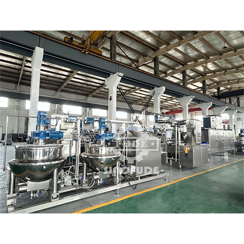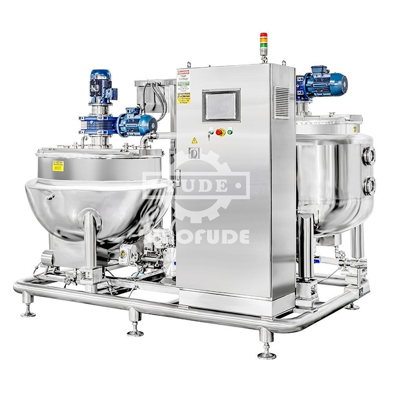 Варочная панель с кожухом и накопительный бак расположены на полке для удобства эксплуатации и очистки. Электрический шкаф управления управляет процессами перемешивания, варки, перемешивания, хранения и т.д. Варочный аппарат с рубашкой используется для растворения сырья, рецептурное соотношение глюкозного сиропа, сахара, воды, порошкообразного геля и т.д. помещается в варочный аппарат, расплавляется и уваривается, после уваривания до определенной температуры подается насосом в резервуар для хранения для обеспечения непрерывного производства. Плиты и решетка полностью изготовлены из нержавеющей стали. Плита может быть с электрическим или паровым нагревом; резервуар нагревается слоем теплой воды при перемешивании, соединенном с резервуаром для горячей воды, который используется для незначительного снижения и поддержания температуры материала, чтобы температура жидкости была равномерной, а сироп после приготовления подается в разливочную машину с помощью насоса.
