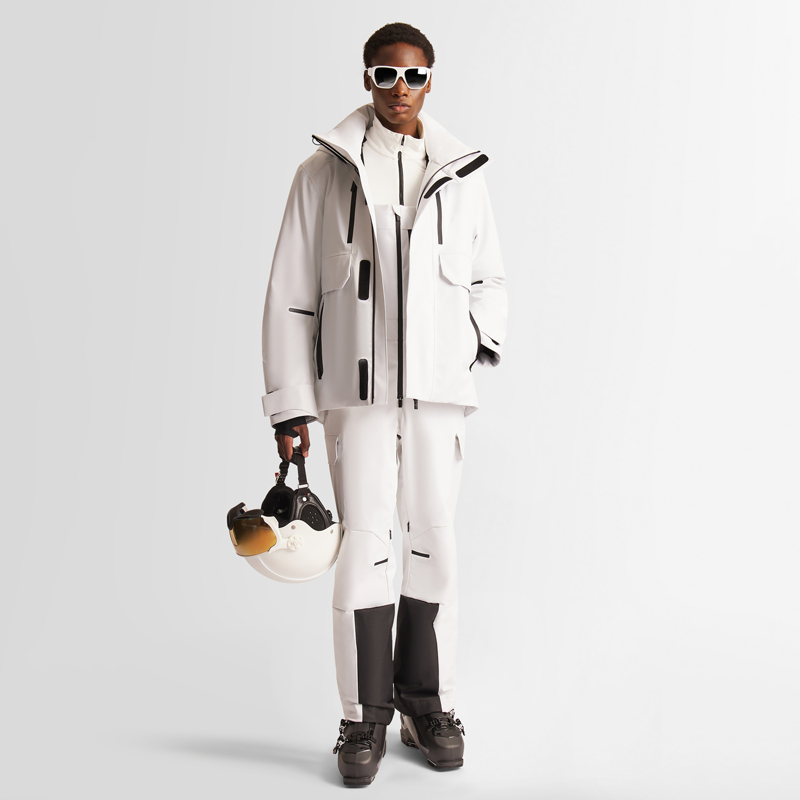 Это мужской лыжный костюм белого цвета, чистая как снег, демонстрирует моду и жизненную силу. Продуманное сочетание черных вспомогательных материалов создает резкий цветовой контраст, добавляя к общему ощущению иерархии и моды.