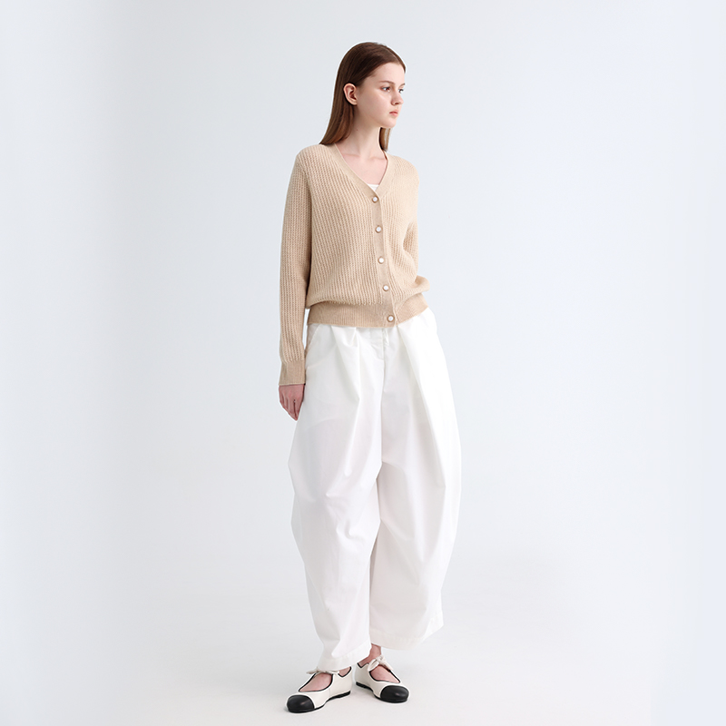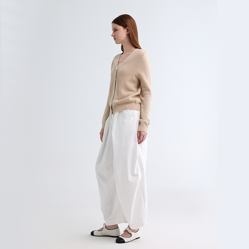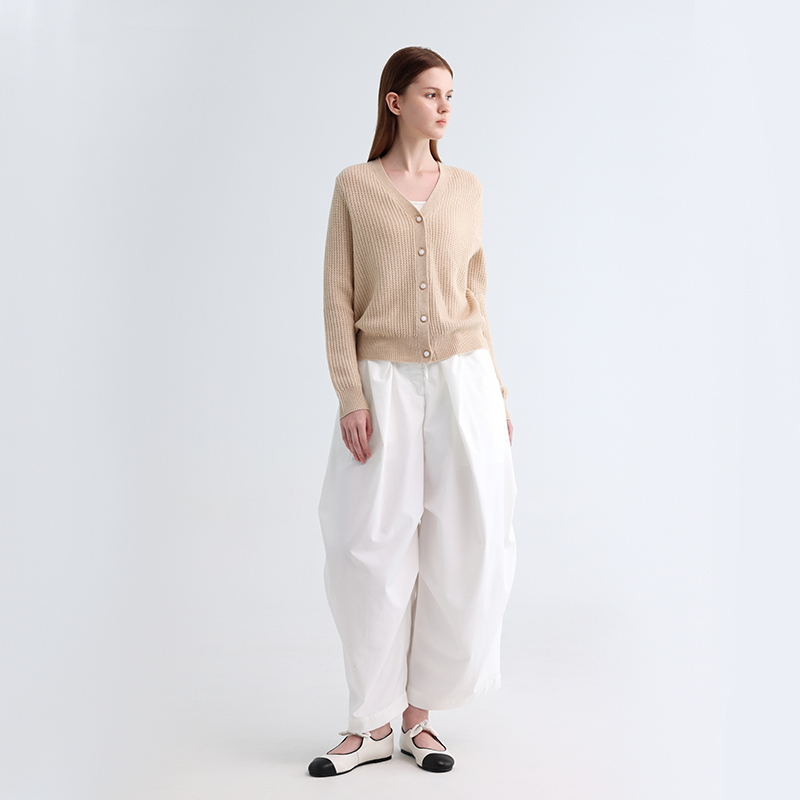 Этот кардиган из овечьей шерсти с V-образным вырезом — осенне-зимняя вещь, сочетающая в себе фактуру и моду. С точки зрения дизайна, классический V-образный вырез — изюминка. Он не только умело удлиняет линию шеи, корректирует контуры лица, делает обладательницу более элегантной и изысканной, но и удобно сочетается с ожерельями и другими аксессуарами, создавая ощущение многослойности. Дизайн одного ряда жемчужных пуговиц добавляет немного утонченности и мягкости общей форме, подчеркивая красоту деталей в простоте. Тканая текстура вертикальных полос усиливает визуальное ощущение трехмерности и в то же время играет определенную роль в стройнении и похудении.