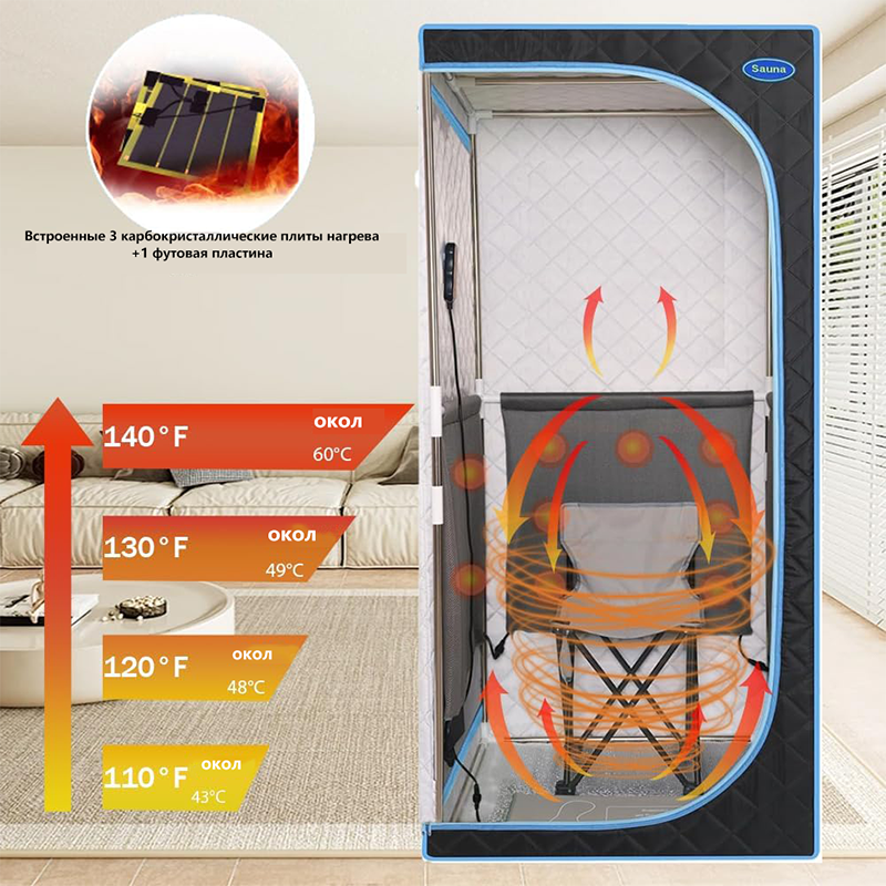 1. материал: углованная полированная ткань с крановой укладкой снаружи, водонепроницаемый ПВХ с покрытием внутри с хлопка в середине. Есть три панели нагрева углерода, каждый нагреватель точно установлен для равномерного, устойчивого тепла. Сауна может быть открыта и омыта непосредственно, что делает ее более чистой и удобной