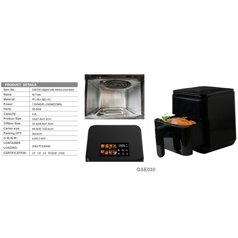 GSE030 - это цифровая фритюрница объемом 4 л, оснащенная верхним 1350 Вт и нижним 250 Вт двойным нагревом и внутренней камерой из нержавеющей стали для эффективного и равномерного приготовления. Эта модель предлагает интуитивно понятное сенсорное управление и современную эстетику кухни. Модель изготовлена из безопасных для пищевых продуктов материалов PP+PA+ABS+PC и имеет сертификаты CE, CB, GS, RoHS, LFGB.