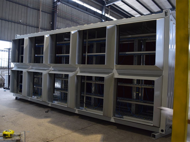 Внешний размер этого шахтного ящика составляет 5900мм * 2200мм * 2560мм.Внутри помещается горнодобывающая машина модели S19, а полка состоит из 7 слоев.На каждом этаже можно разместить по 28 горных машин.Всего в коробке размещено 196 горных машин.