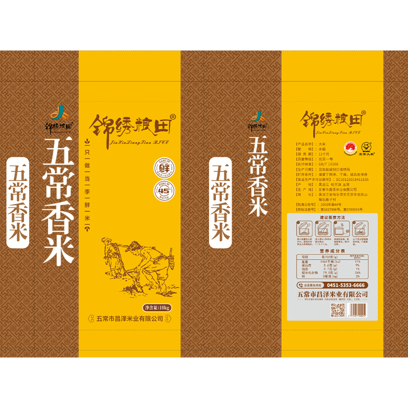Зерновые поля пять постоянных мягких упаковок с ароматным рисом для упаковки риса, мягкая упаковка 10 кг размер около 33,5 × 61 × 6,5 см, большая емкость, доступный выбор, подходит для больших семей и небольших закупок общественного питания. Композитная мягкая упаковка пищевого класса, влагонепроницаемость, защита от насекомых, защита от окисления, продление срока годности. фасад упаковки на фоне пейзажей пяти постоянных рисовых полей, логотип бренда и название продукта привлекательны; Задняя сторона помечает подробную информацию о продукте, некоторые районы используют вакуумную мягкую упаковку, плюс дизайн руки, чтобы облегчить обработку и хранение. Отбор высококачественных сортов риса, подходящих для выращивания пяти постоянных, выращивается на плодородной черной земле пяти постоянных, где используется чистая вода для орошения. Следуйте зеленой концепции, использование физической, биологической борьбы с вредителями и болезнями, искусственная прополка. После созревания риса, после сбора урожая, сушки, а затем через шелушение, измельчение риса, полировку, цветной отбор и другие процессы, низкотемпературная обработка сохраняет оригинальный вкус.
