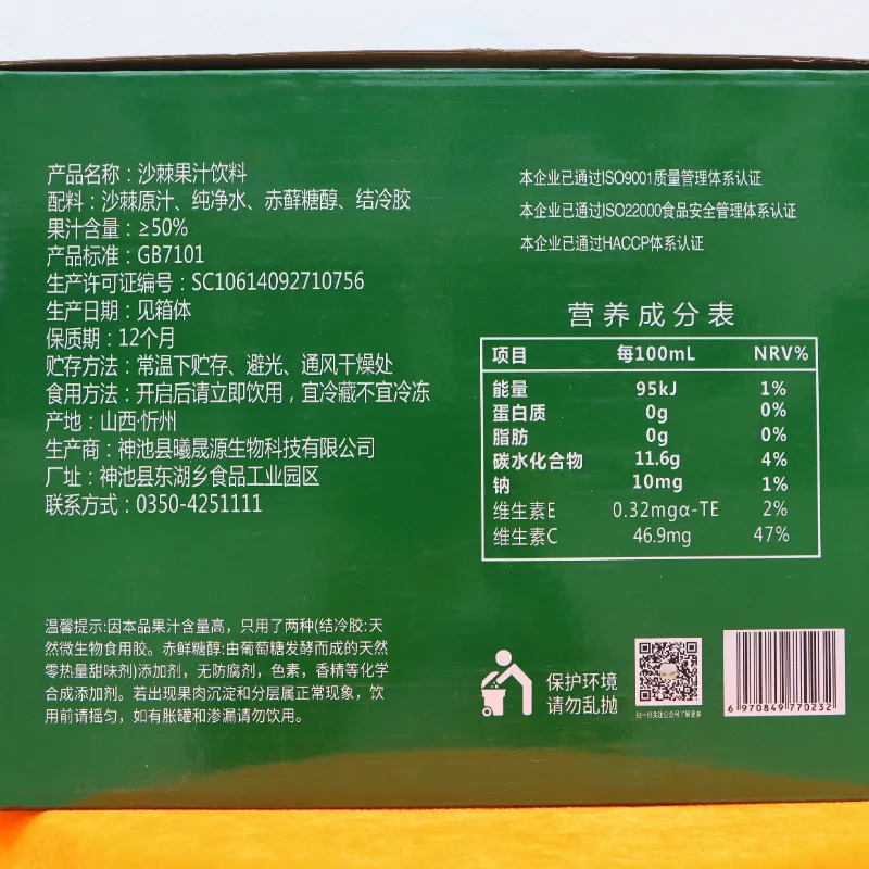 Дацишуан облепиховый сок 236 мл 10 банок (без белого сахара) производится в Шэньчи, провинция Шаньси. Изготовленный исключительно из ягод дикой облепихи, выращенной в экологически чистой среде, Daqishuang использует уникальный процесс сырого отжима, чтобы каждая капля была пропитана эссенцией облепихи. Напиток содержит 50% сока, богатого витаминами C и E, флавоноидами и другими питательными веществами. Он обладает мягким, кисло-сладким вкусом с ярко выраженным, слегка ферментированным ароматом. Он удовлетворяет вкусовые рецепторы и обеспечивает организм необходимыми питательными веществами, что делает его идеальным напитком для тех, кто стремится к сбалансированному питанию и изысканному вкусу.