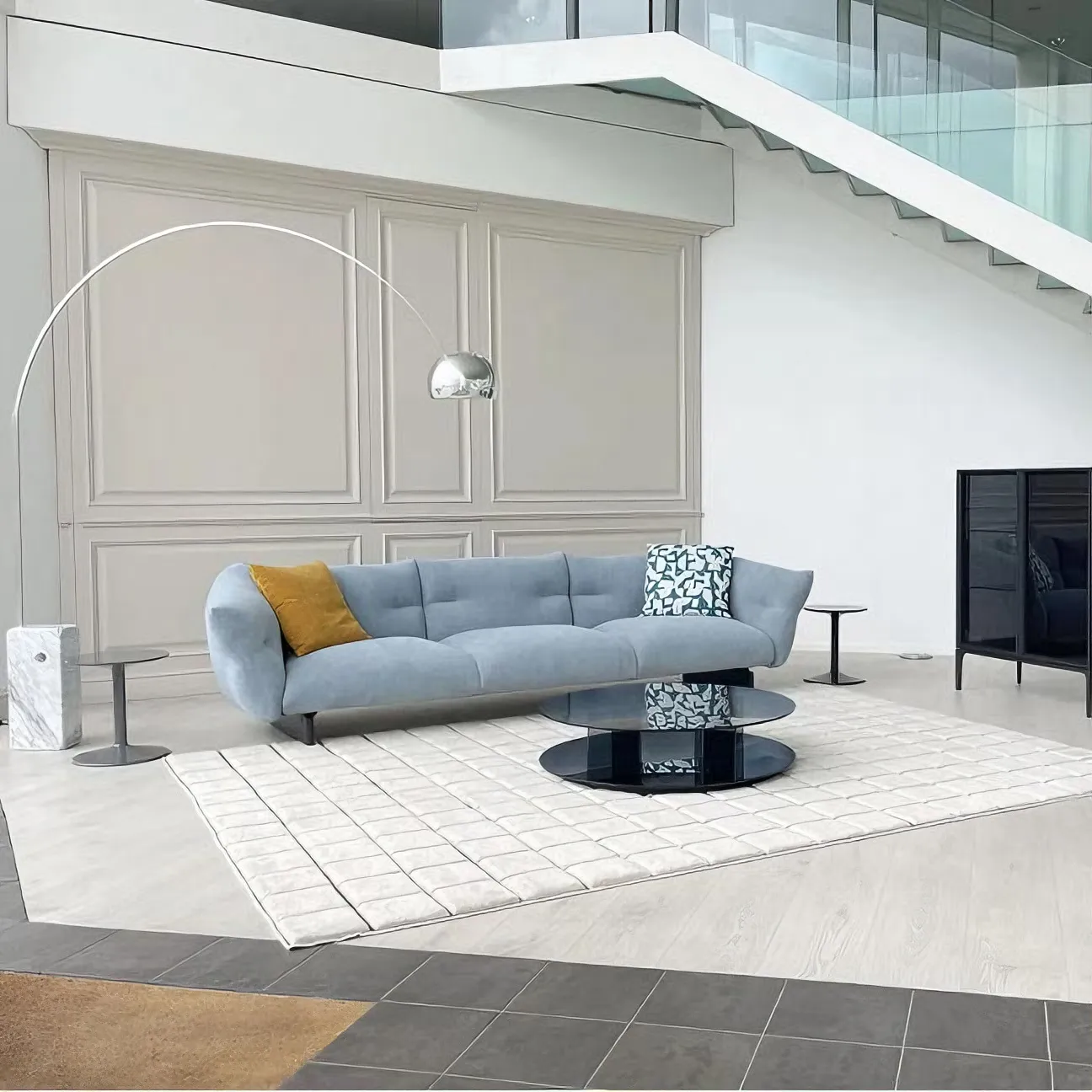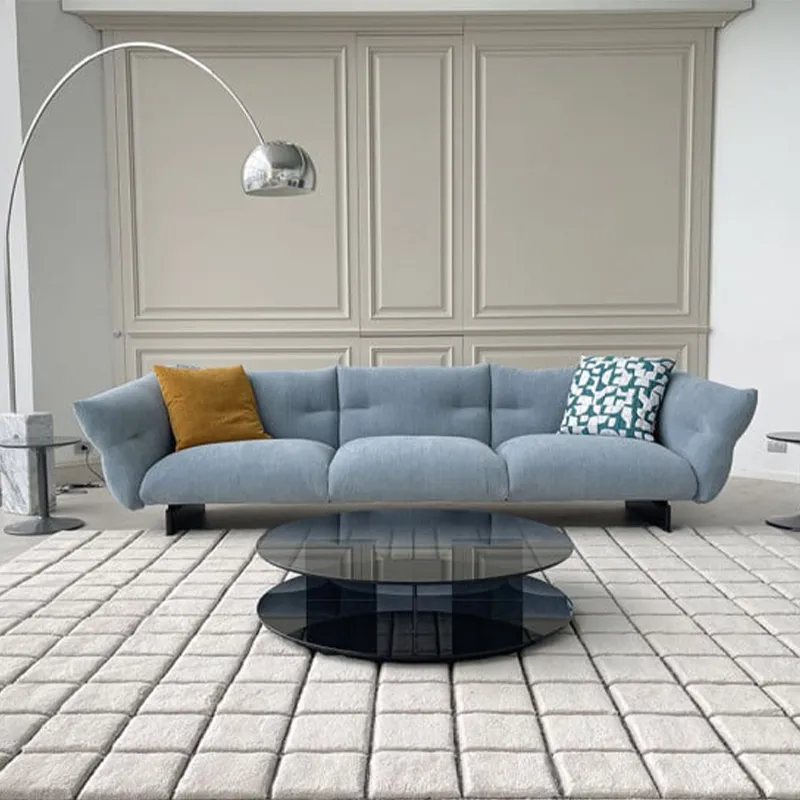 Диван Moncloud, представленный в нашем выставочном зале в рамках выставки Предложение Экспо, имеет черную основу и обивку из ткани голубого цвета. В комплект входят 2 тканевые подушки (55x55 см), одна желтая и одна с темно-бирюзовым и белым узором (задняя часть темно-бирюзового цвета).