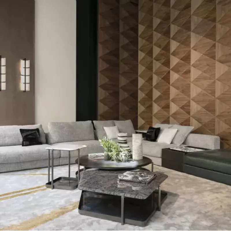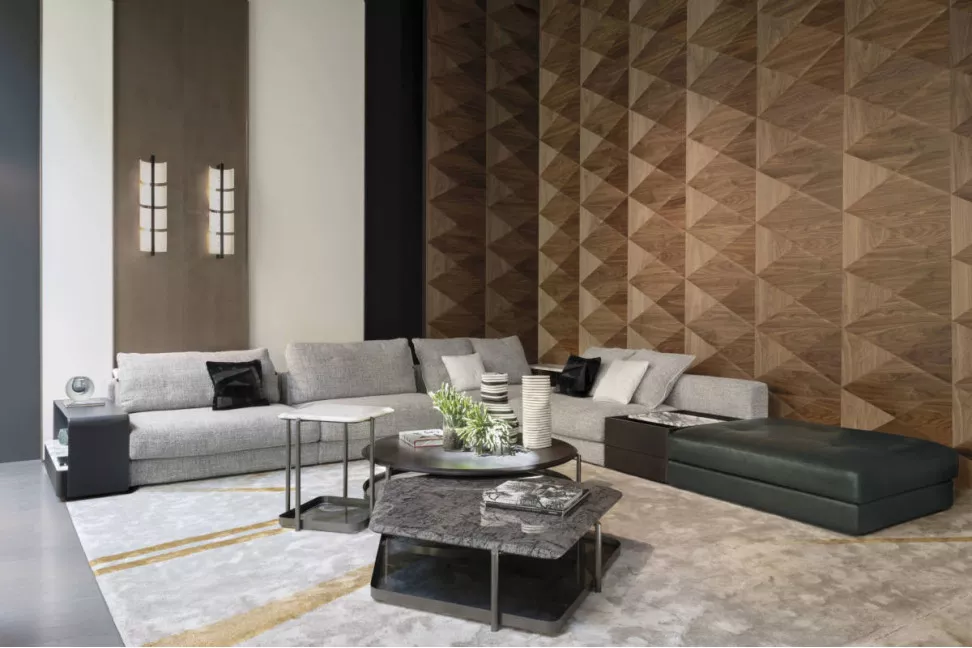 Диван Skyline можно дополнить такими аксессуарами, как журнальные столики, пуфы и декоративные подушки, чтобы удовлетворить все практические и эстетические потребности. Пуф, также доступный с асимметричным стеганым узором, добавляет системе дополнительный элемент комфорта и стиля. Журнальный столик Skyline доступен в двух вариантах. Угловые журнальные столики изготовлены с каркасом и столешницей из ясеня или мрамора. Также можно добавить элемент с ящиком из ясеня и съемным подносом, с мраморной или металлической столешницей с отделкой пелтрокс и раковиной из закаленного стекла серого или бронзового цвета. Журнальные столики из ясеня с боковыми полками отличаются элегантным и практичным дизайном. Верхняя поверхность доступна в различных вариантах, включая мрамор, металл с отделкой пелтрокс или кожу. Также можно добавить раковину из закаленного стекла серого или бронзового цвета.
