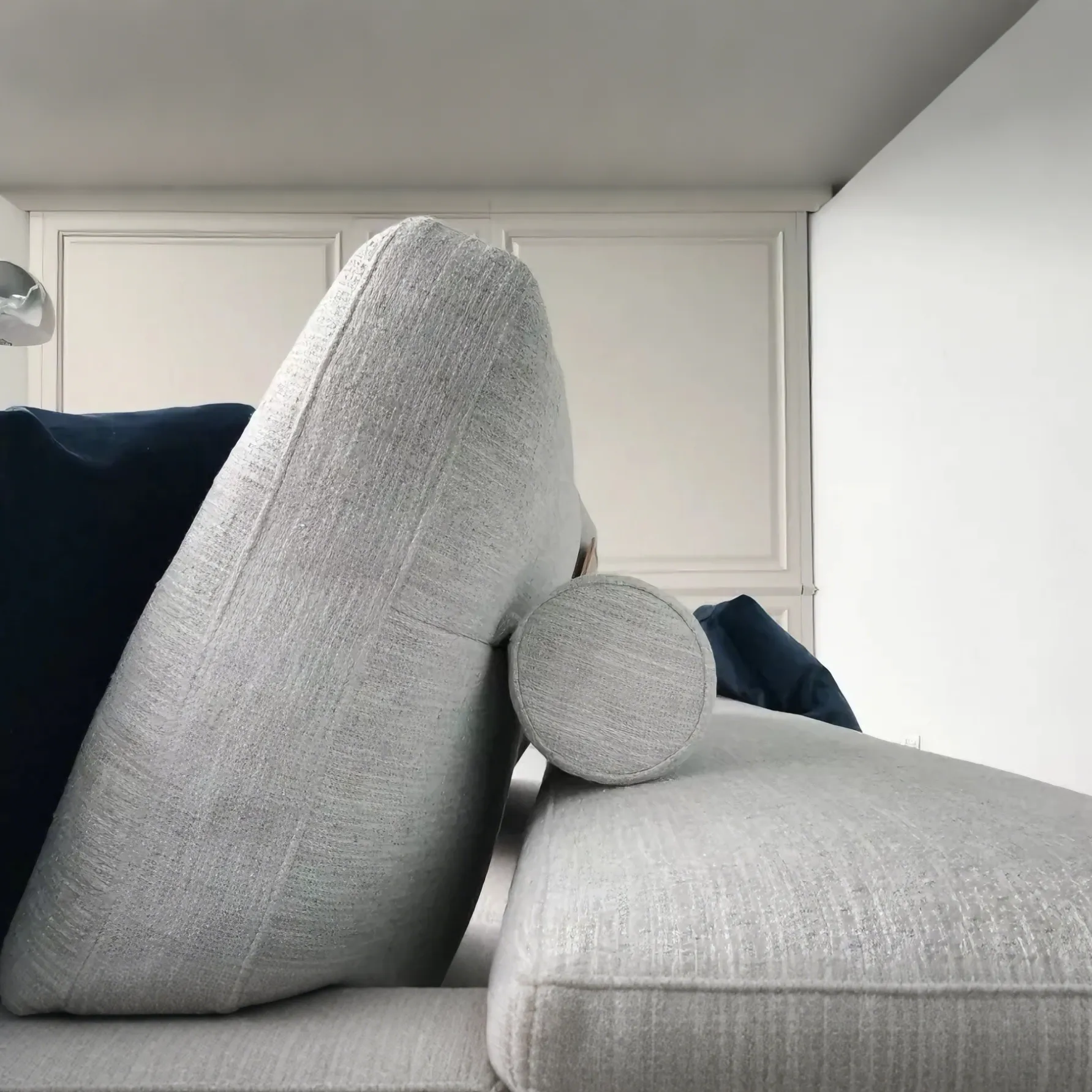 Элементы сиденья и подушки для спинки обтянуты светло-серой тканью. Декоративные подушки обтянуты синим бархатом.