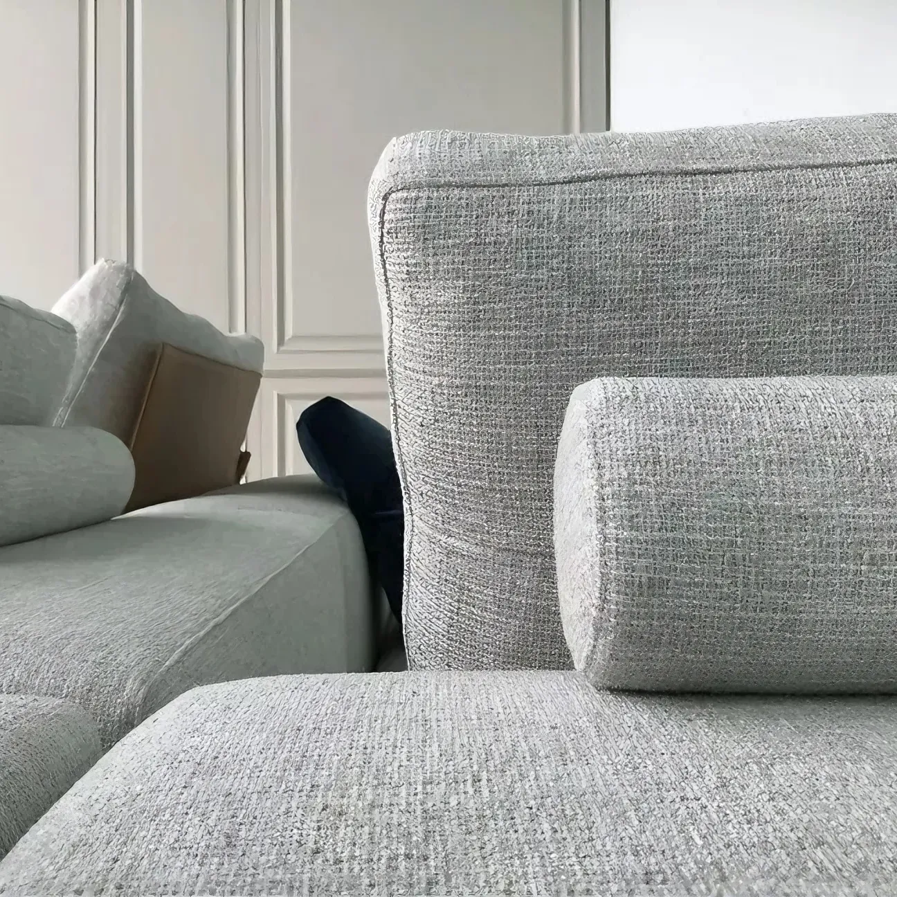 Диван Westside, представленный в нашем выставочном зале в рамках выставки Предложение Экспо, отличается значительными размерами, благодаря чему он становится абсолютным центром гостиной. Сиденья и подушки для спинки обтянуты светло-серой тканью, которая элегантно сочетается с синим бархатом декоративных подушек.