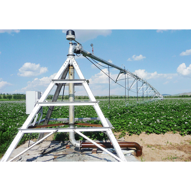 Это центр вращения дождевальной машины. Представляет собой пирамидальную раму, состоящую из стойки, балки и скользящей плиты. В середине поддерживается стояк и колено осевого вала. Колено осевого вала может свободно вращаться в поворотной втулке и соединено с трубопроводом первого пролета через шаровой шарнир. Скользящая плита закреплена на бетонном фундаменте центральной опоры с помощью цепи. На центральной опоре также закреплен центральный шкаф управления, а токоприемное кольцо установлено на колене осевого вала.