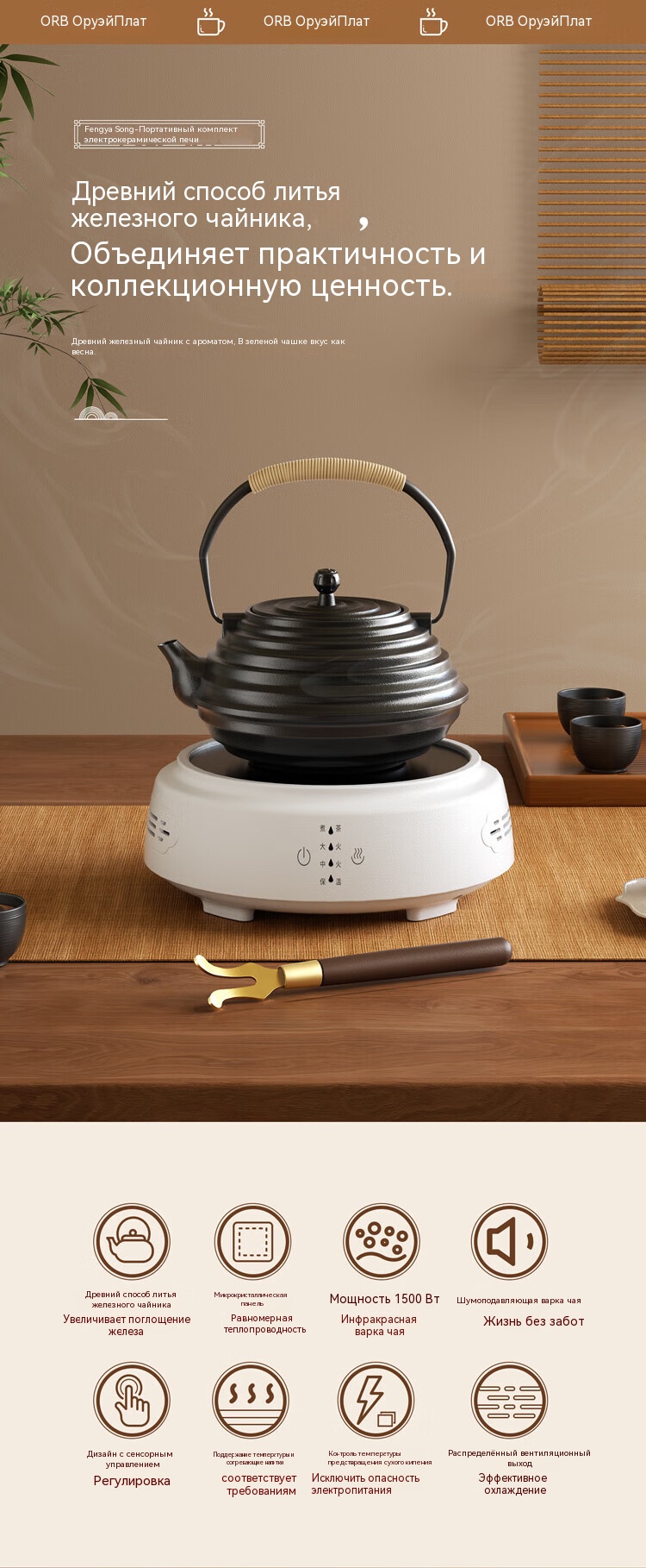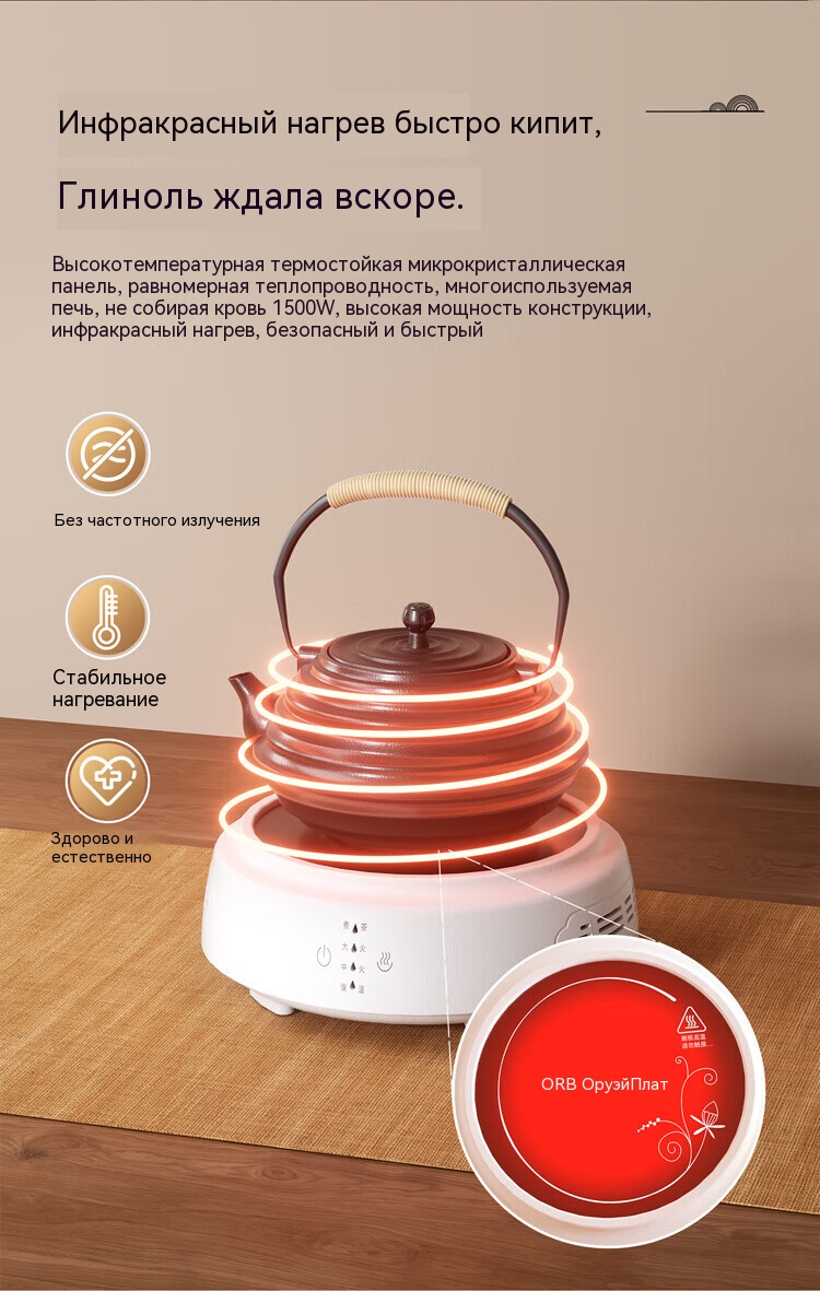 Мощность 1500 Вт, инфракрасный нагрев, функция автоматического отключения через 20 минут.
