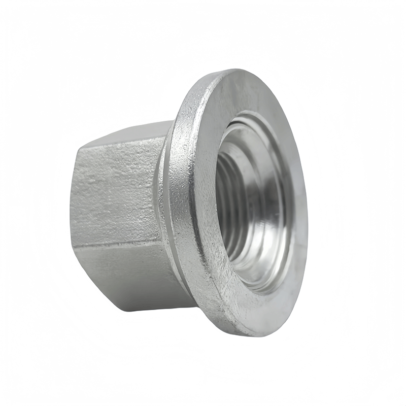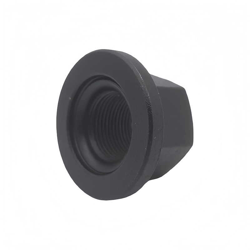 Гайка строго соответствует стандарту ISO 2320 для стопорных гаек и имеет уникальную коническую посадку (угол 60°), обеспечивающую идеальное прилегание к колесному диску и равномерное распределение усилия затяжки. Специальная фланцевая поверхность с противоскользящими насечками эффективно предотвращает ослабление гайки, сохраняя надежное крепление даже в условиях сильной вибрации. Внутренняя резьба класса точности 6H, обработанная методом точной накатки, имеет высокую чистоту поверхности, что гарантирует идеальное сопряжение с колесными болтами.