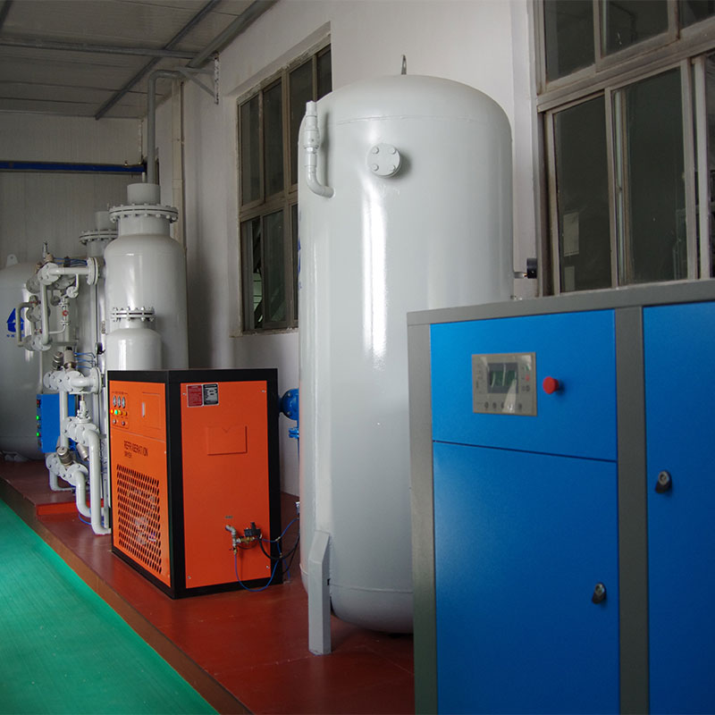 (2) Воздушный ресивер: балансирует давление; (3) Система очистки: рефрижераторный осушитель и трехступенчатая система фильтрации, полностью удаляет масло, воду и пыль; (4) Адсорбционно-разделительное устройство: конструкция с двумя адсорберами, заполненная адсорбентом; (5) Интеллектуальная система управления: PLC программное управление, онлайн-мониторинг параметров расхода газа и чистоты; (6) Система буферизации азота: резервуар для хранения азота и система регулирования.