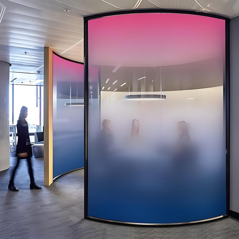 Градиентное стекло — гармония технологии и эстетики, универсальное для любых пространств. Плавный переход от одного цвета к другому (например, от синего к белому или от розового к прозрачному) часто используется в декоративных стенах, перегородках или художественных инсталляциях. Постепенное изменение от прозрачного к матовому или непрозрачному идеально подходит для помещений, где важно сочетание конфиденциальности и естественного освещения (например, ванные комнаты или офисные перегородки). Текстура поверхности, переходящая от нежной к грубой, создает визуальную глубину и широко применяется в художественном стекле или дизайне мебели.