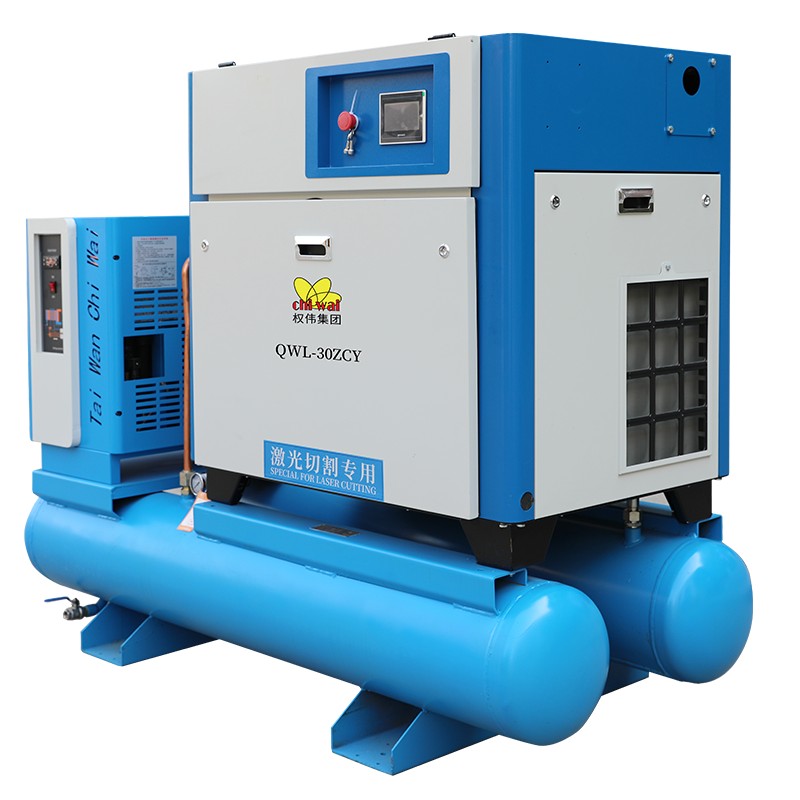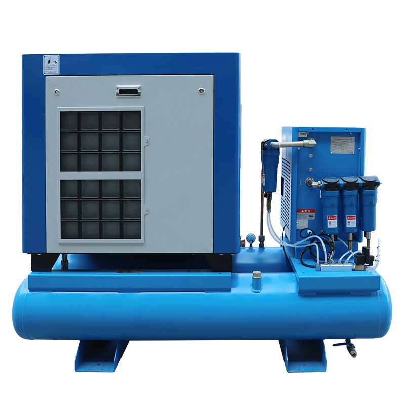 Комплексный винтовой компрессор оснащён встроенным охладителем, что позволяет поддерживать низкую температуру на выходе, а также включает встроенный фильтр для удаления воды, обеспечивая хорошую эффективность охлаждения осушителем. Встроенный осушитель воздуха позволяет удобно подать сжатый воздух, обеспечивая стабильное давление.