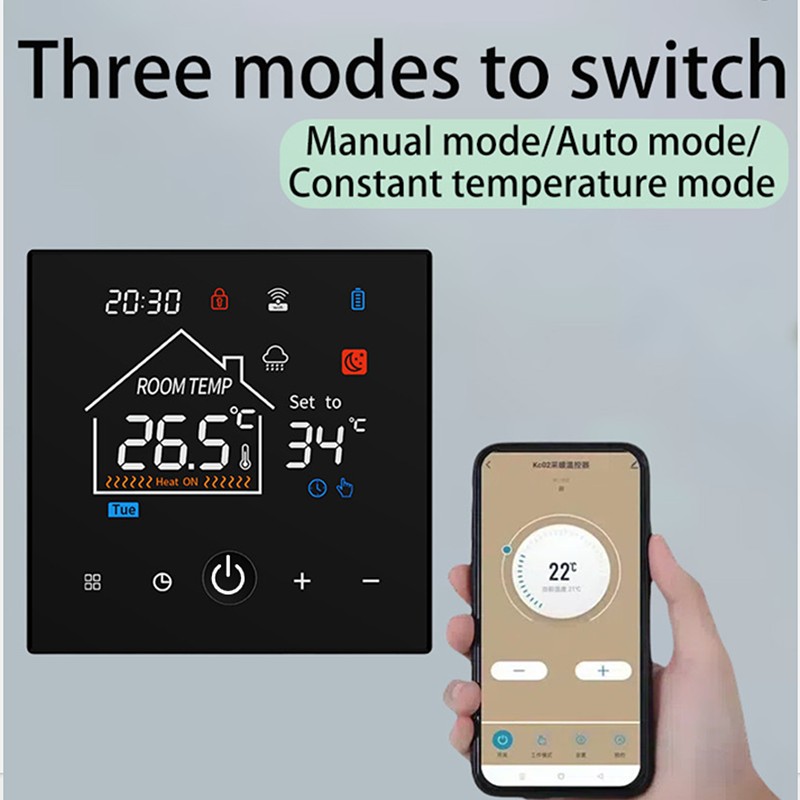Цифровой термостат, является использование микрокомпьютерной технологии управления, полноэкранный дисплей сенсорные клавиши, элегантный и щедрый дизайн прост в использовании, термостат имеет ручную автоматическую функцию, программируемую функцию, функцию памяти состояния функция блокировки ребенка, с WIFI может получить погоду влажность.