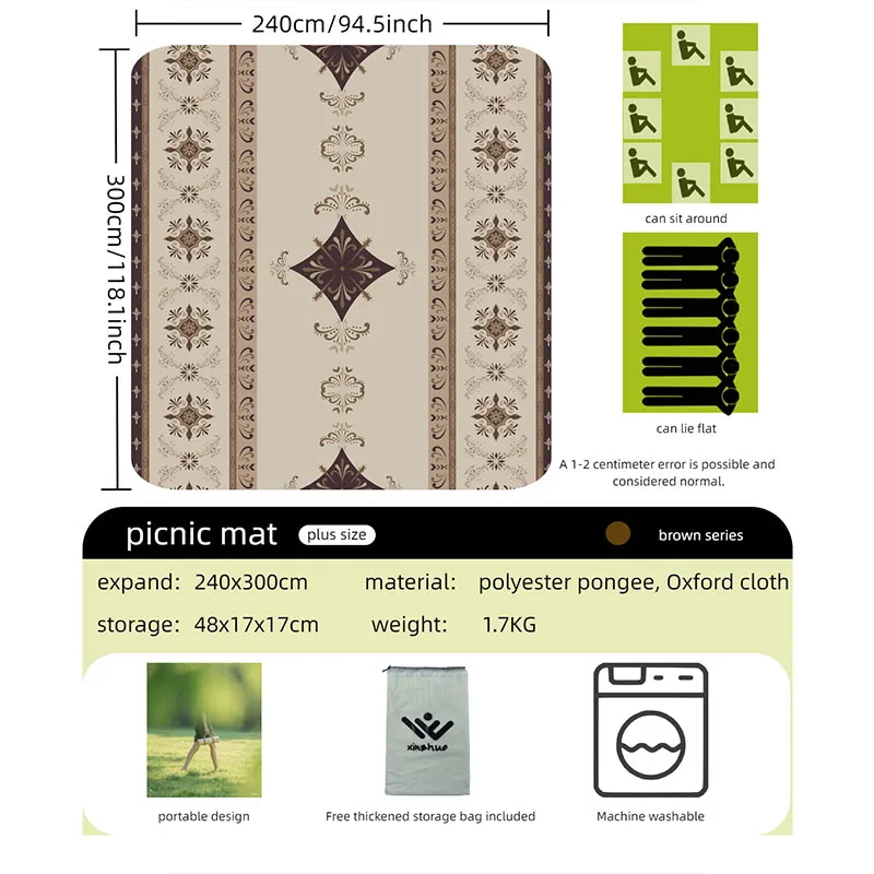 1 шт, увеличенный пикниковый коврик размером до 240*300 см, подходит для различных сценариев: кемпинг, пикник, пляж. Цельная упаковка для хранения, безопасно без формальдегида, тепло- и влагоизоляция, не прилипает песок и трава, мягкий, можно стирать в стиральной машине, серия "коричневый этнический стиль". Водоотталкивающая ткань из весенней тафты, влаго- и грязеотталкивающая, износостойкая, проста в уходе. Двойное оксфордское дно, влаго- и теплоизоляция. Ультразвуковое закрепление ваты, можно многократно стирать в стиральной машине, портативный и легко складывается, готов к использованию после раскрытия.