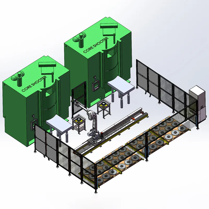 Роботизированная автоматическая выемка и сборка стержней способна удовлетворить потребности в извлечении продукции весом от десятков до сотен килограммов из стержневых машин без повреждения поверхности песчаных стержней, обеспечивая точность сборки. Мы можем выбрать роботов различных брендов (ABB, FANUC, EFORT, ESTUN, KUKA и др.) в соответствии с требованиями заказчика, а также изготовить захватные устройства и оснастку для позиционирования по индивидуальному заказу под конкретную продукцию, что позволяет одновременно захватывать и собирать один или несколько видов изделий.