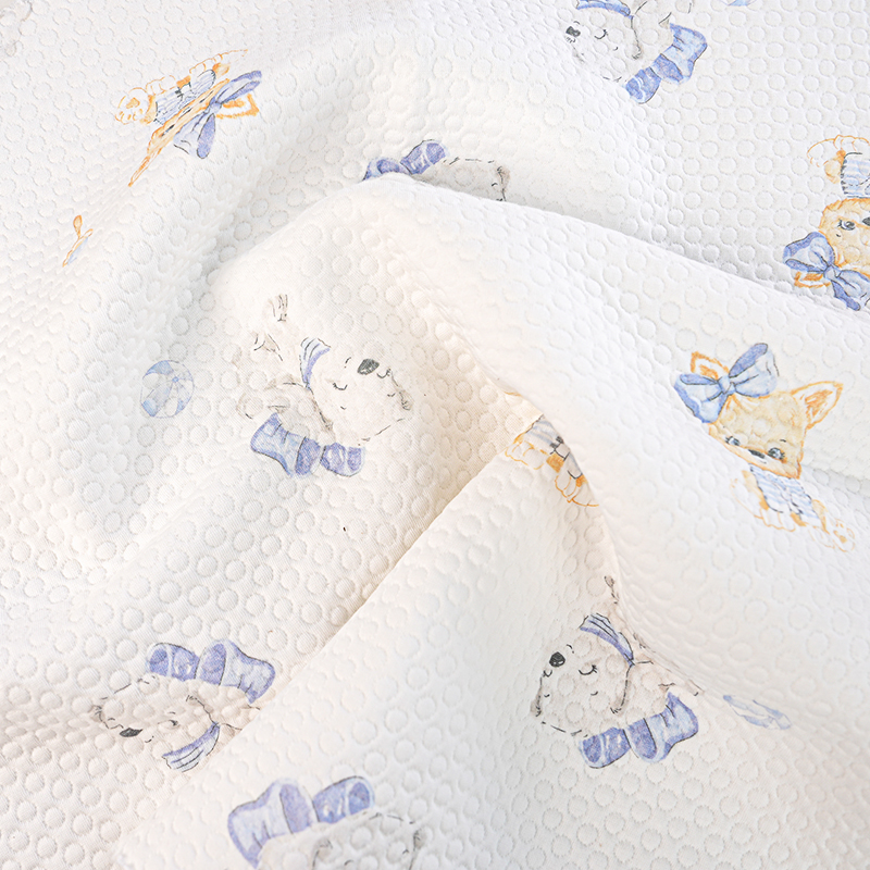 Это жаккардовая ткань с тремя слоями шелка шириной 185 см и весом 320 г/м2. Структура ткани и характеристики этой ткани таковы, что трехслойный шелк, воздух, хлопок состоит из двух слоев ткани со слоем пушистой пряжи-наполнителя (например, полиэстеровой низкоэластичной пряжи), зажатой между ними, чтобы сформировать воздушный сэндвич, который отлично сохраняет тепло и пропускает воздух. Смесь хлопка и полиэстера, сочетающая мягкость и приятность для кожи хлопка с износостойкостью и устойчивостью к складкам полиэстера, подходит для нижнего белья для младенцев и детей. Печатный рисунок четкий, нетоксичен и безопасен и соответствует стандартам для детских товаров. Стеганая трехслойная конструкция, стеганый жилет или стеганый трехслойный комбинезон, с использованием подкладки из чистого хлопка + промежуточной теплой пряжи, легкая и теплая, подходит для осени и зимы. Преимущества тканей с воздушным слоем: высокая пушистость, хорошая эластичность, возможность стирки и нелегкая деформация, подходят для детских изделий, которые часто стираются. Это ткань стандарта безопасности класса А.