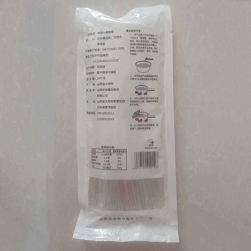 Картофельная кристаллическая Фенпи, от крахмала в машину до готовой вермишели, Фенпи из машины, для полной автоматизации работы, ингредиенты картофельный крахмал, соль, питьевая вода, все производство в соответствии с национальным стандартом GB17400-2015 стандартов, полностью воплощает производство зеленых, охраны окружающей среды, природных, безопасных, высококачественных, питательных концепции производства, внешний вид продукта является регулярным, бар тип как один, цвет и блеск однородности кристалла, чистота и гигиена, легко хранить, легко транспортировать. Гигиеничен, удобен в хранении и транспортировке. Он устойчив к кипячению и замачиванию, имеет хорошую текстуру, разнообразные способы приготовления, такие как жарка, тушение и варка, легко сочетаются с различными блюдами и становятся хорошим продуктом на столе. Характеристики продукта: 90 г вермишели, 150 г вермишели.