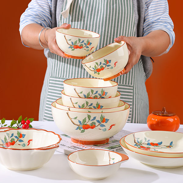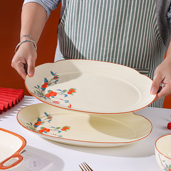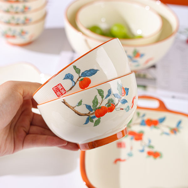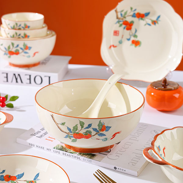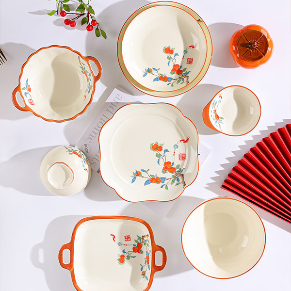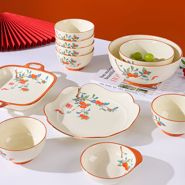 Эта посуда с тематикой каки сочетает в себе восточное искусство ручной росписи и дизайн — раскидистые ветви и сочные красные каки символизируют «удачу во всех делах» и передают добрые пожелания. Молочно-белая глазурь в сочетании с теплым оранжевым кантом выглядит свежо и фактурно, подходит для сервировки русских блюд: будь то насыщенный борщ, обильное жаркое или изысканные холодные закуски, посуда и блюда дополняют друг друга, придавая русскому столу уникальный восточный колорит.