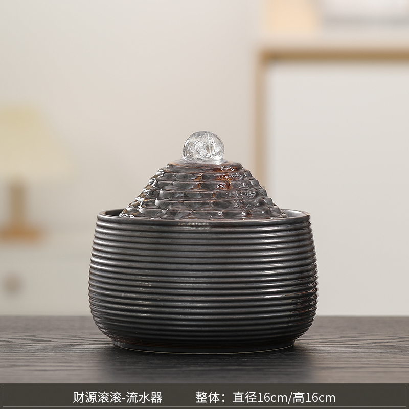 Керамический фонтан-декор «Чёрная лестница с жемчужиной» воплощает идею движения вперёд и гармонии. Основой композиции является ступенчатая конструкция из чёрной керамики, символизирующая постепенный рост и развитие. На верхней ступени размещена прозрачная вращающаяся жемчужина, которая плавно крутится под напором воды, олицетворяя поток удачи и энергии.