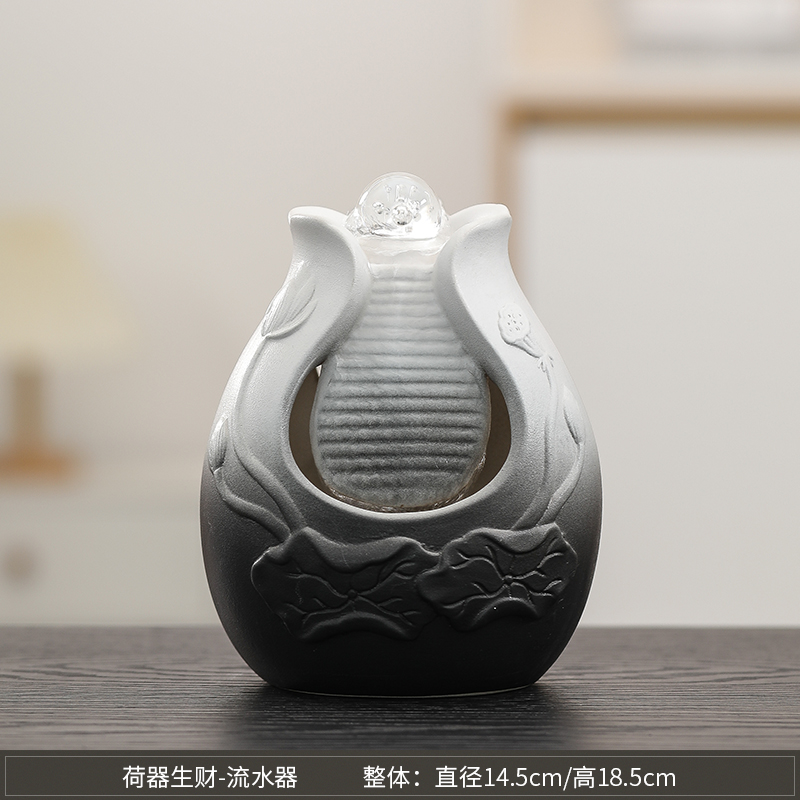 Керамический фонтан-декор «Лотос приносит удачу» создан по мотивам классического символа чистоты и гармонии. Основным элементом композиции выступает изящный лист лотоса, из которого вытекает вода. На его верхушке расположена прозрачная вращающаяся жемчужина, которая движется благодаря потоку воды и символизирует приход удачи и благополучия.