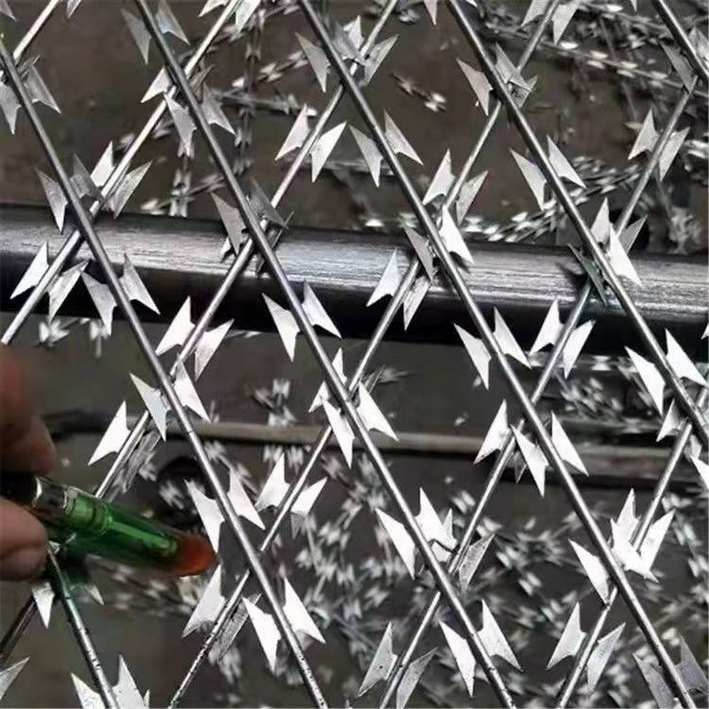 Спиральная колючая сетка с поперечными колючками изготовлена из двух колючек с пластиной из нержавеющей стали и оцинкованной стальной пластиной между ними в качестве мощной пряжки зажима, которая при растягивании принимает форму креста.