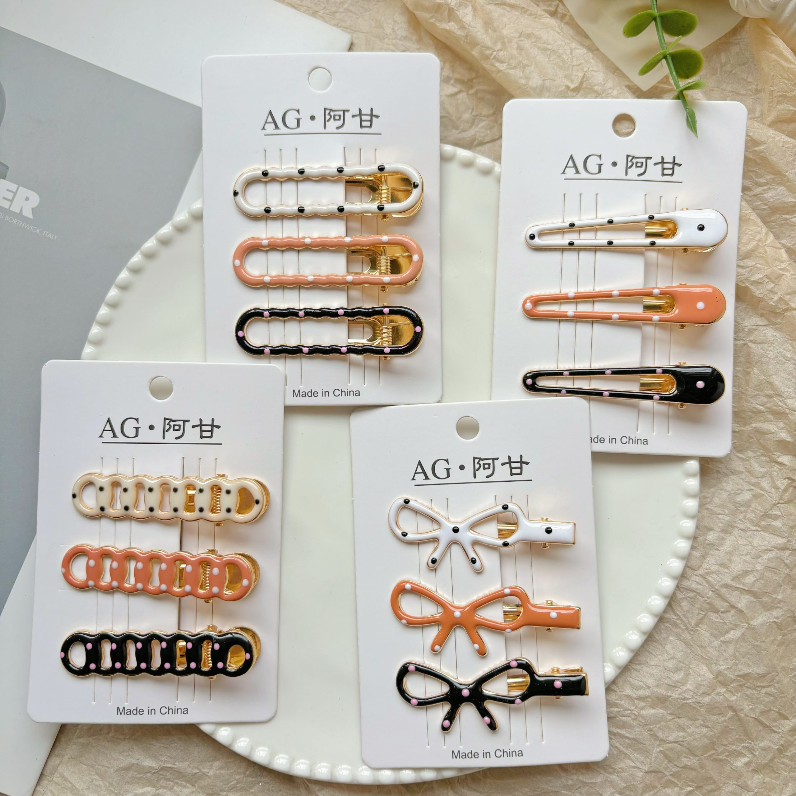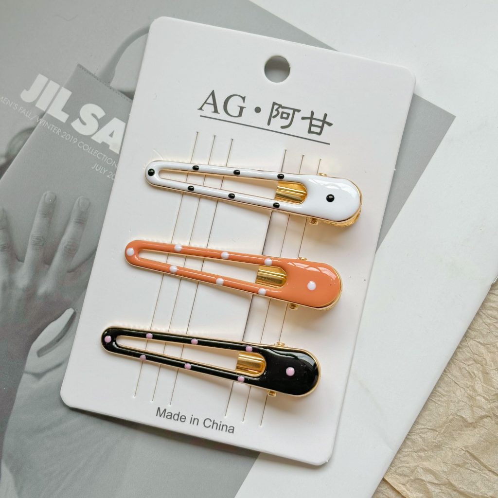 Дизайн: В ассортименте представлены как лаконичные удлинённые модели, так и милые заколки с бантами, удовлетворяющие различные стилевые предпочтения. Техника капельного нанесения точечного узора делает заколки особенно привлекательными: изысканное сочетание цвета слоновой кости с аккуратными чёрными точками подчёркивает элегантность; нежный розовый с игривыми белыми точками излучает девичье очарование; классический чёрный с нежно-розовыми точками добавляет современности и индивидуальности. Каждая цветовая комбинация продумана до мелочей, словно тщательно созданное произведение искусства.
