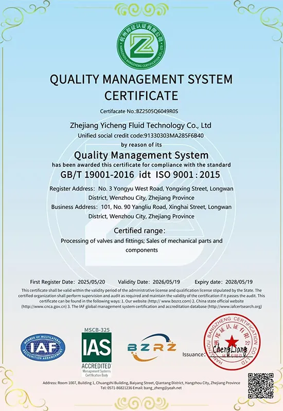 ООО Чжэцзян Ичэн Флюид Технологии специализируется на исследованиях, разработке и производстве промышленных клапанов, предлагая широкий ассортимент продукции, включая задвижки, запорные клапаны, шаровые краны и обратные клапаны. Наша продукция, строго соответствующая стандартам ISO/API, широко используется в нефтяной, химической и энергетической отраслях. Благодаря исключительной герметичности, долговечности и профессиональному обслуживанию мы предоставляем нашим клиентам безопасные и надежные решения для управления потоками жидкостей.