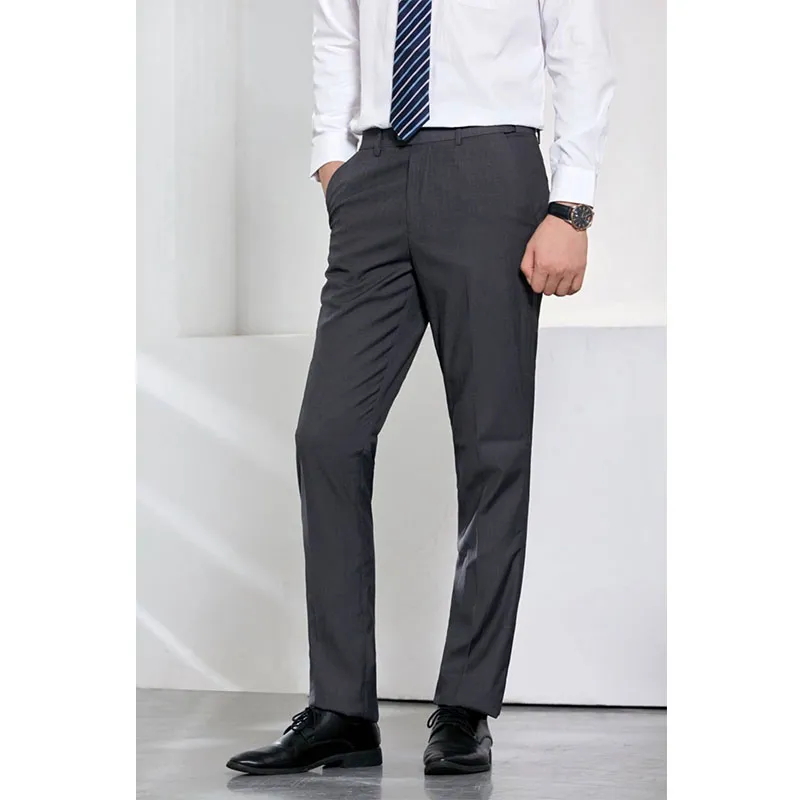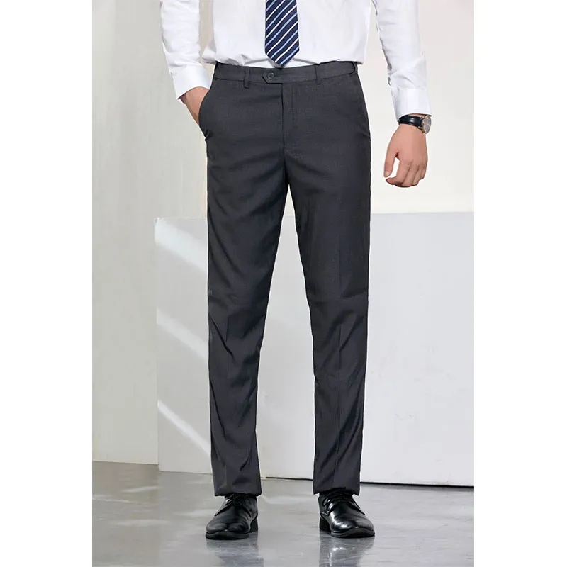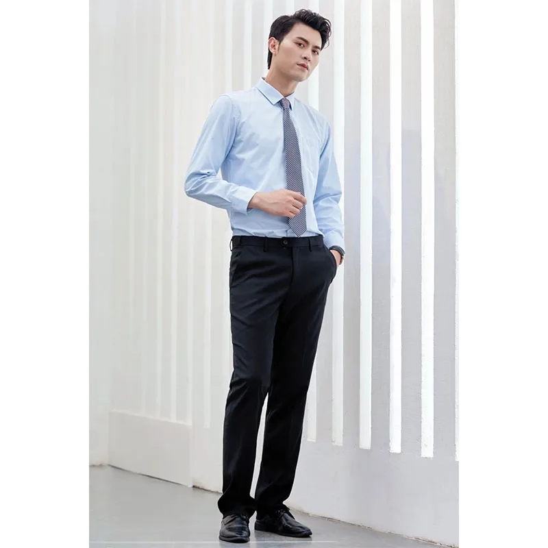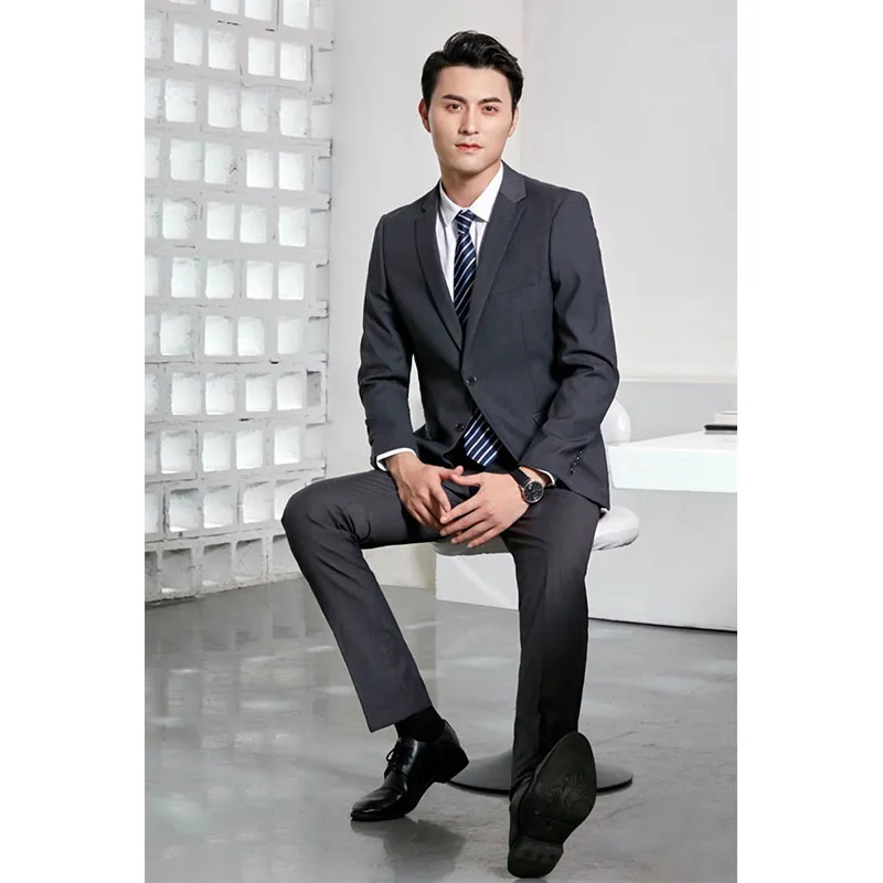 Покрой – душа этого костюма. Мужская версия имеет однобортный двубортный дизайн с заостренными лацканами, четкими линиями, приталенной талией и естественной отделкой плеч, демонстрируя достойный и элегантный вид. Женская версия еще более изысканна, идеально подчеркивая женскую фигуру благодаря однобортной застежке на три пуговицы, узкому лацкану и четко очерченной талии. Ее облегающий, но не стесняющий движений силуэт одновременно утонченный и стильный. Брюки как мужской, так и женской версии имеют узкий прямой крой с четкими линиями и правильной длиной, подчеркивая эргономичную конструкцию костюма.