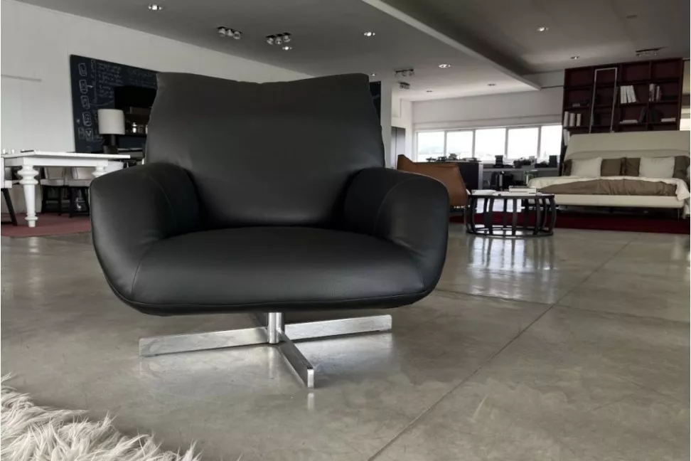Кресло Chiara, представленное в нашем выставочном зале, — это поворотная версия с черной кожаной обивкой, матовой основой и отделкой из полированного хрома-никля.