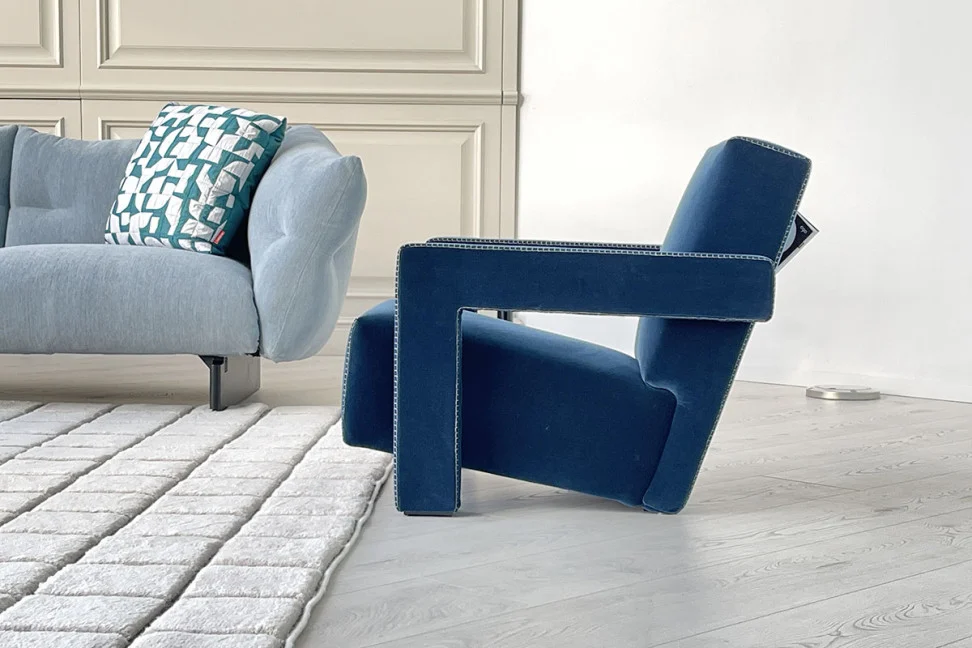 Кресло Utrecht, представленное в нашем выставочном зале, имеет синюю бархатную обивку и конную строчку, которая определяет его периметр.