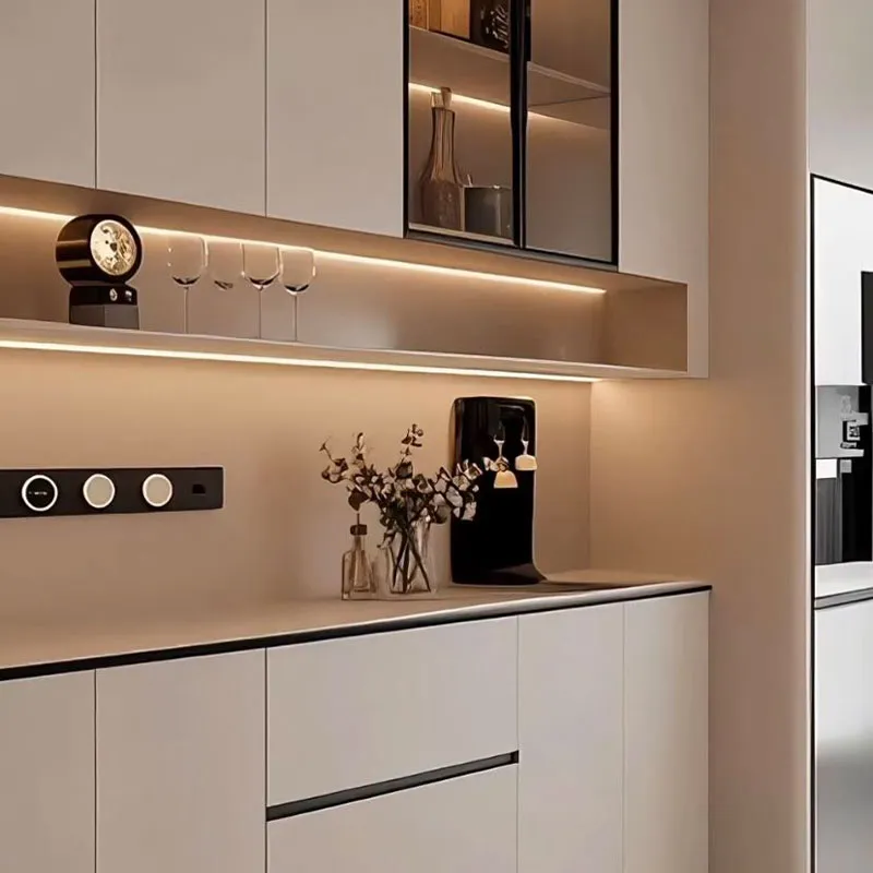 Экономит пространство в маленьких помещениях, за счет отсутствия выступающих элементов (обычных ручек) на мебельных дверцах.