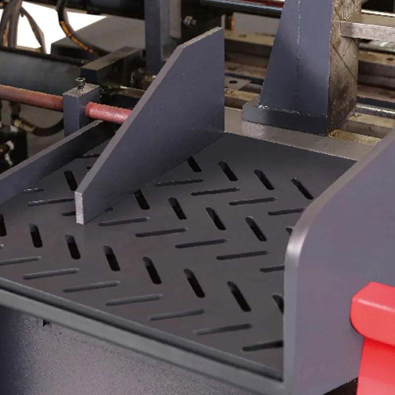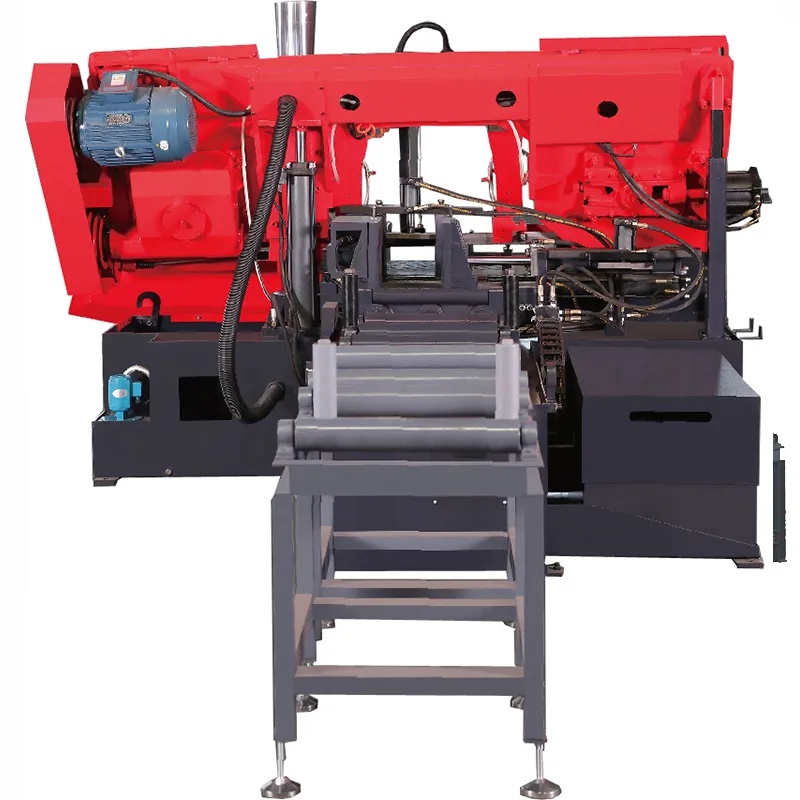 Ленточнопильный станок с ЧПУ модели GZ4240 выполнен в цельном колонном горизонтальном конструктивном исполнении. В основе лежит Т-образное основание, в центральной части которого установлена гидравлическая система зажима и подачи; вся пильная рама (лук) установлена через основную и вспомогательную стойки на задней половине основания, а подъемный гидроцилиндр обеспечивает вертикальное перемещение пильной рамы и ее рабочую подачу; главный приводной механизм справа от пильной рамы приводит во вращение ведущее колесо, слева натяжное устройство натягивает ведомое колесо и пильную ленту, а по центру левый и правый направляющие кронштейны по обе стороны от зажимных тисков заготовки обеспечивают вертикальное направление пильной ленты вниз; управление осуществляется с помощью PLC и сенсорного экрана, подача контролируется посредством оптической линейки, точность однократной подачи может достигать ±0,2 мм.