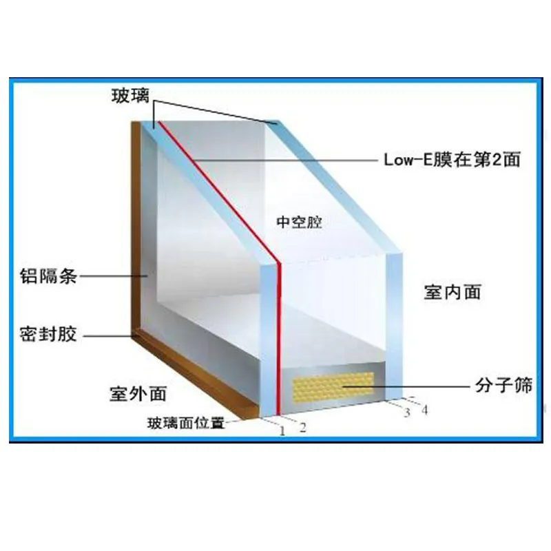 Структура и принцип работы: Как показано на рисунке, это стекло состоит из двух стекол (1 и 2), алюминиевой прокладки и герметика, образующих герметичную полость. Ключевым элементом является низкоэмиссионная пленка, нанесенная на внутреннюю сторону одного из стекол (обозначена как второе стекло на изображении). Эта пленка является основой его энергосберегающих свойств; она действует как «умное зеркало», пропуская видимый свет и отражая большую часть инфракрасного теплового излучения. Молекулярные сита на дне стекла поглощают влагу внутри полости, поддерживая ее сухость и обеспечивая долговременную стабильность работы.