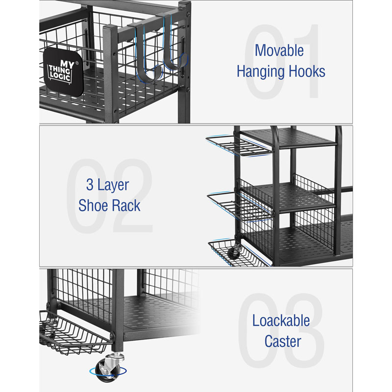Эта стойка для хранения гольф-оборудования вмещает до 3 сумок. Она оснащена 3 ярусами для обуви и 4 съемными крючками, чтобы хранить все ваше гольф-оборудование в одном месте.
