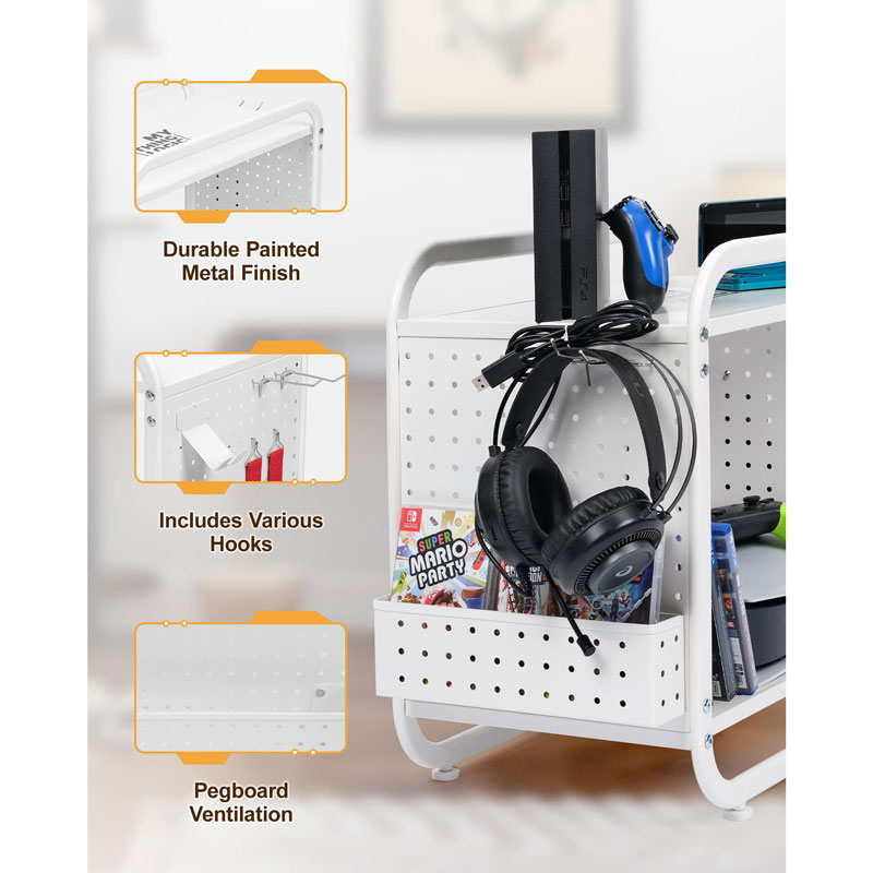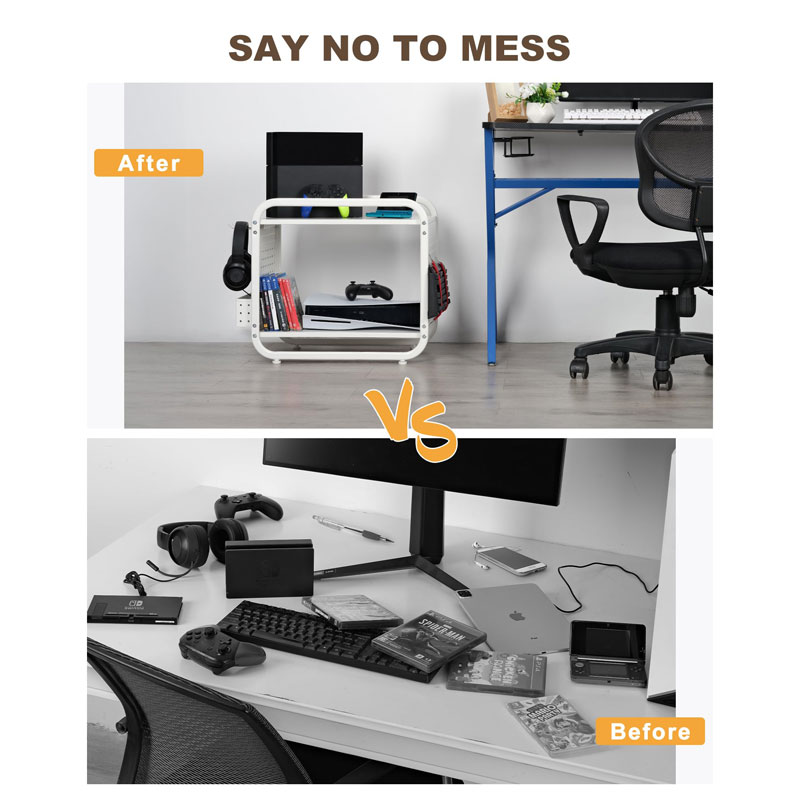 Оснащенный эластичными ремнями, крючками для хранения и боковой корзиной, этот стеллаж сочетает в себе держатель для контроллеров, подставку для наушников и органайзер для игровой консоли в одном месте, что уменьшает беспорядок и позволяет быстро настроить все необходимое во время игровых сессий.