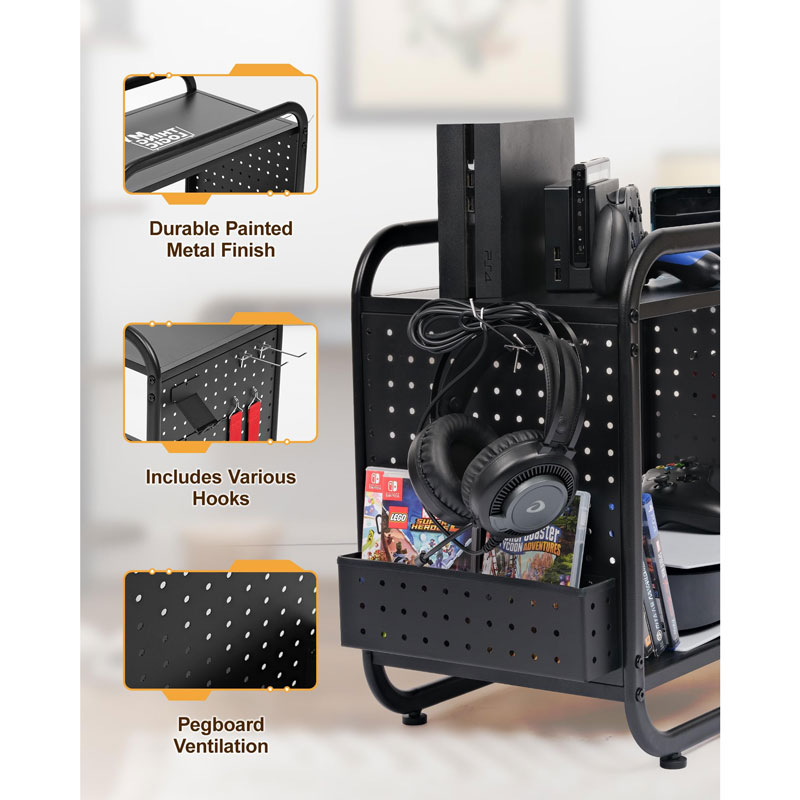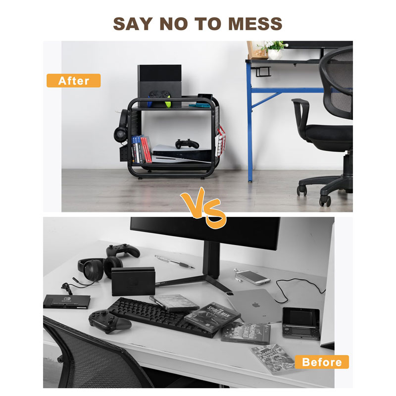 Оснащенный эластичными ремнями, крючками для хранения и боковой корзиной, этот стеллаж сочетает в себе держатель для контроллеров, подставку для наушников и органайзер для игровой консоли в одном месте, что уменьшает беспорядок и позволяет быстро настроить все необходимое во время игровых сессий.