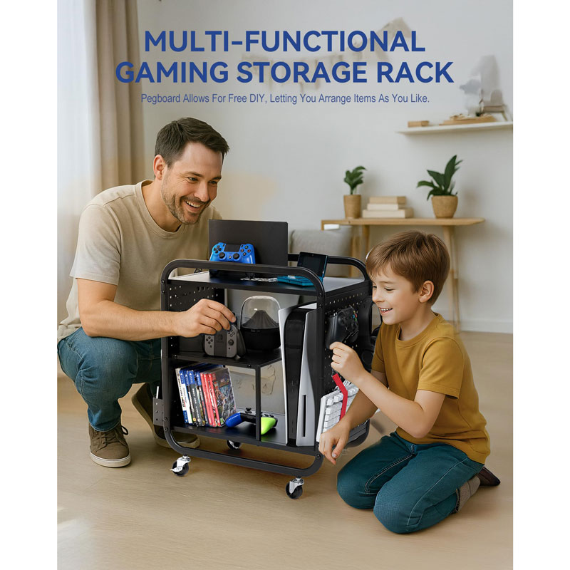 Практичный подарок для геймеров, идеально подходящий для дней рождения или новоселья. Обеспечивает аккуратную организацию и легкий доступ к консолям, контроллерам, наушникам и игровым дискам.