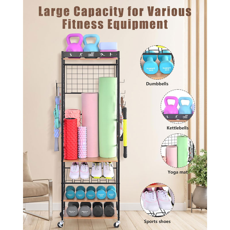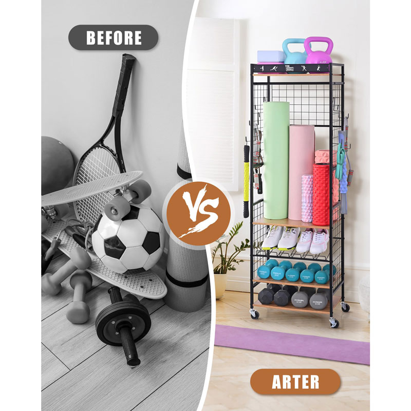 Эта домашняя стойка для хранения спортивного оборудования поможет вам хранить коврик для йоги, гантели, гири, кирпич для йоги, резиновые ленты, роликовый диск, поролоновый валик и т. д., а также полотенце для тренажерного зала. Все необходимое для тренировок в одном месте.
